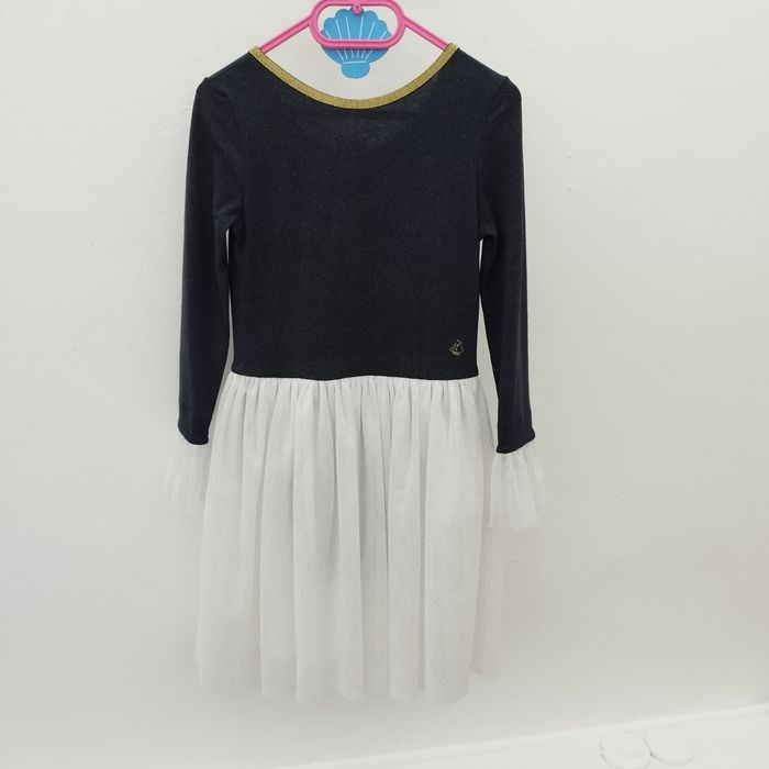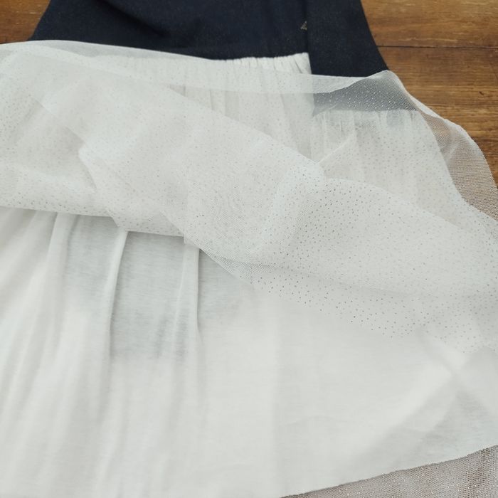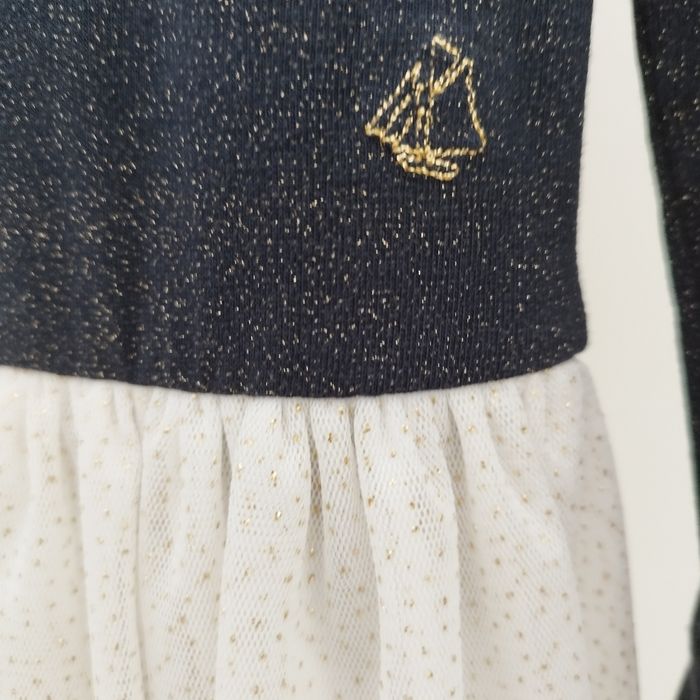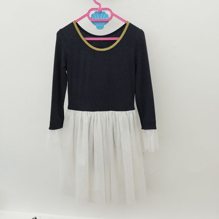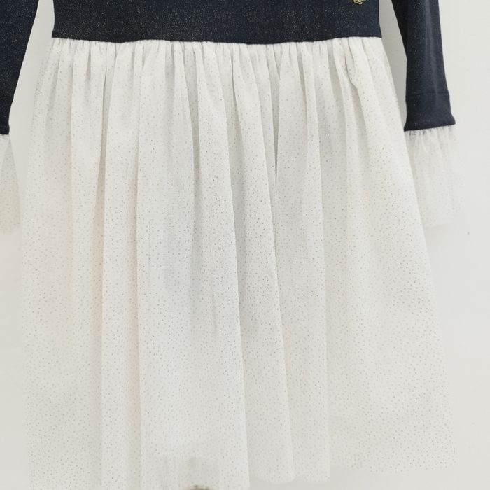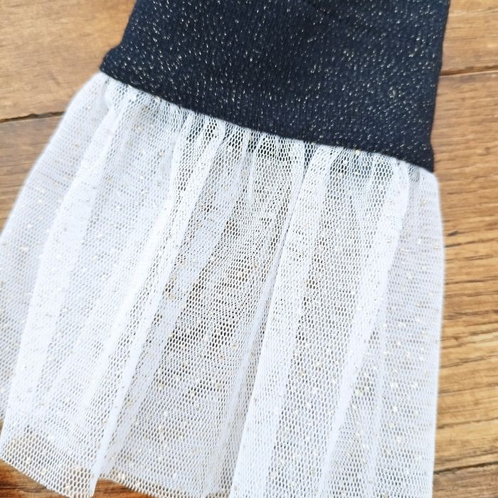 Robe de fête, chic et élégante conçue pour les princesses d'aujourd'hui. Cette robe body à manches longues effet deux-en-un associe un body en jersey lycra et une jupe en tulle pailleté. On apprécie les détails: de l'encolure dorée dégagée et au raffinement des volants sur ses poignets rehaussés de tulle. Robe en excellent état, peu portée.