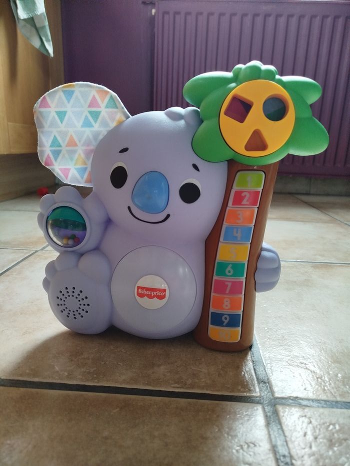 Nicolas le koala propose à l'enfant d'apprendre les chiffres, les formes et compter. Les 10 boutons d'activation lumineux encourageront l'enfant à découvrir les 70 chansons. Avec cet ami Koala sur un palmier, bébé va faire une découverte surprenante : sur cet arbre poussent des carrés, des triangles et des cercles. Nicolas le Koala, l’un des Linkimals de Fisher-Price, sera l’ami musical de bébé pour lui apprendre les chiffres, les formes et à compter jusqu'à 10 grâce à des lumières, des phrases et des chansons entraînantes. Avec également une oreille souple froufroutante et une boule à faire tourner idéales pour la manipulation et l’exploration. Ventre qui s’allume et poignée pour que bébé puisse emporter son ami partout. Jeu d'éveil pour apprendre en s’amusant avec un adorable koala interactif. Placez le jouet à proximité d’autres Linkimals pour qu’ils se parlent, chantent, s’illuminent et jouent ensemble !