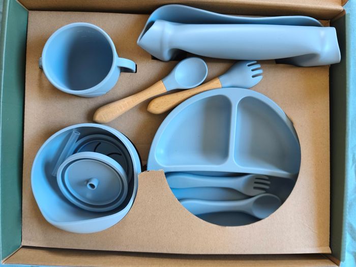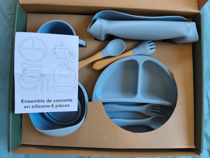 Vends lot neuf de vaisselle en silicone et bois pour bébé en apprentissage des repas. Neuf, ouvert pour les photos. 10 pieces:2 jeux de couverts, 1 assiette compartiment, 1 bol, 1 verre à paille, 1 bavoir... 🌟 Envoi rapide et soigné, filmé par sécurité