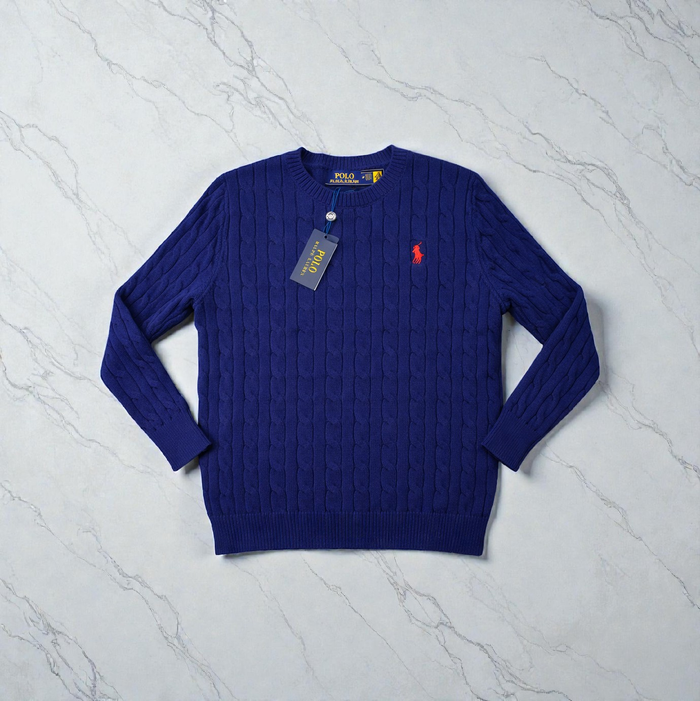 Pull torsadé à col rond Ralph Lauren - Taille M - Bleu marine logo brodé rouge - Neuf