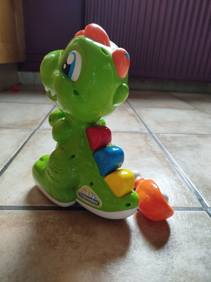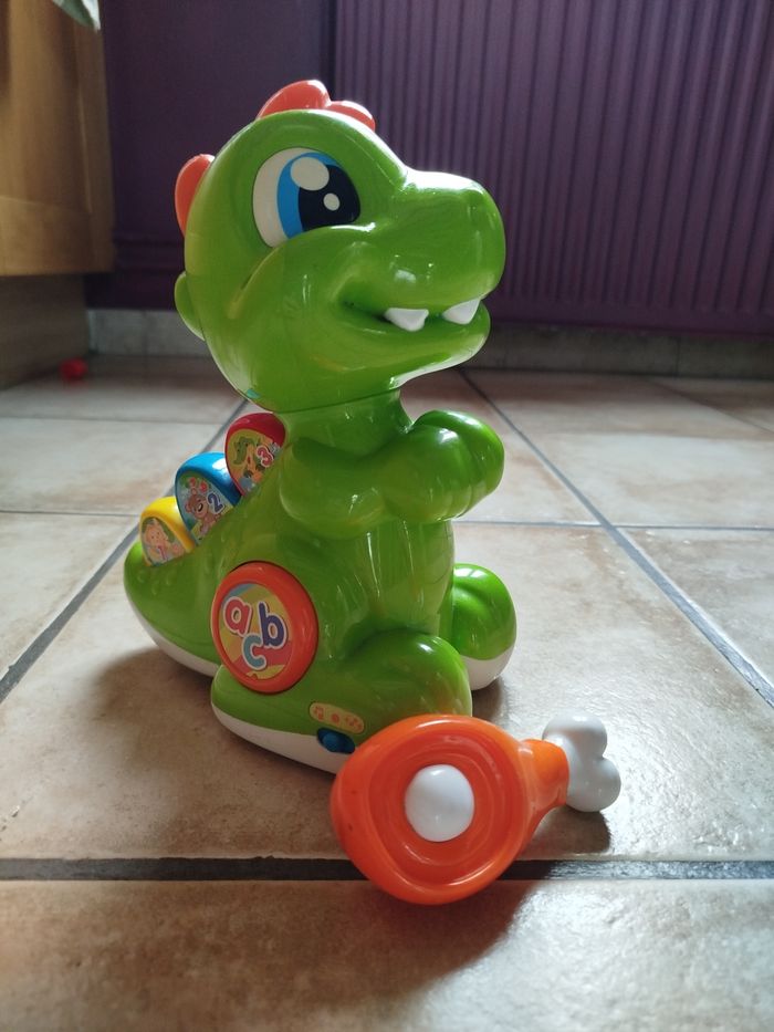 Baby T-Rex est un adorable dinosaure électronique qui parle, chante et bouge.• En appuyant sur les trois boutons sur son dos et sur sa tête, le Baby T-Rex se mettra en marche et tournera sur lui-même.• Il se déplace aussi quand son hochet en forme d'os est agité.• Baby T-Rex est un jouet électronique éducatif qui enseigne les nombres et des mots, le cri des animaux et leur habitat. Il chante aussi des chansons et des comptines.