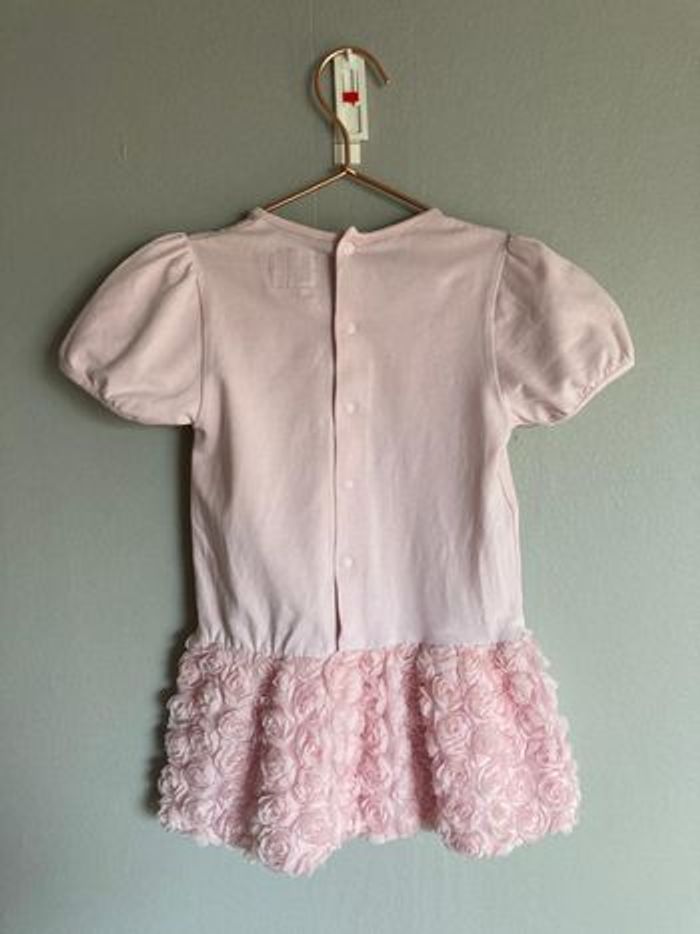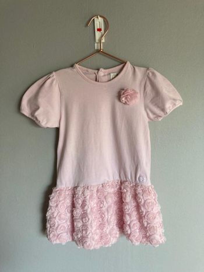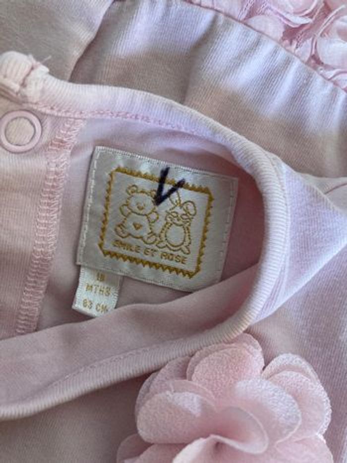 Magnifique robe de la marque Emile et Rose, idéale pour un baptême, un mariage ou une belle fête de famille. 🎀 Design : Un haut en jersey de coton très doux avec une rose en relief et de petites perles. Jupe : Un travail magnifique de roses en mousseline/tulle pour un effet princesse tout en délicatesse. Pratique : S'ouvre entièrement dans le dos par boutons-pression pour un habillage ultra facile (voir photo du dos). Taille : 18 mois (83 cm). État : Très bon état général. À noter : une petite marque au feutre est présente sur l'étiquette intérieure (voir photo), totalement invisible portée. Une pièce d'une douceur incroyable pour bébé. ✨