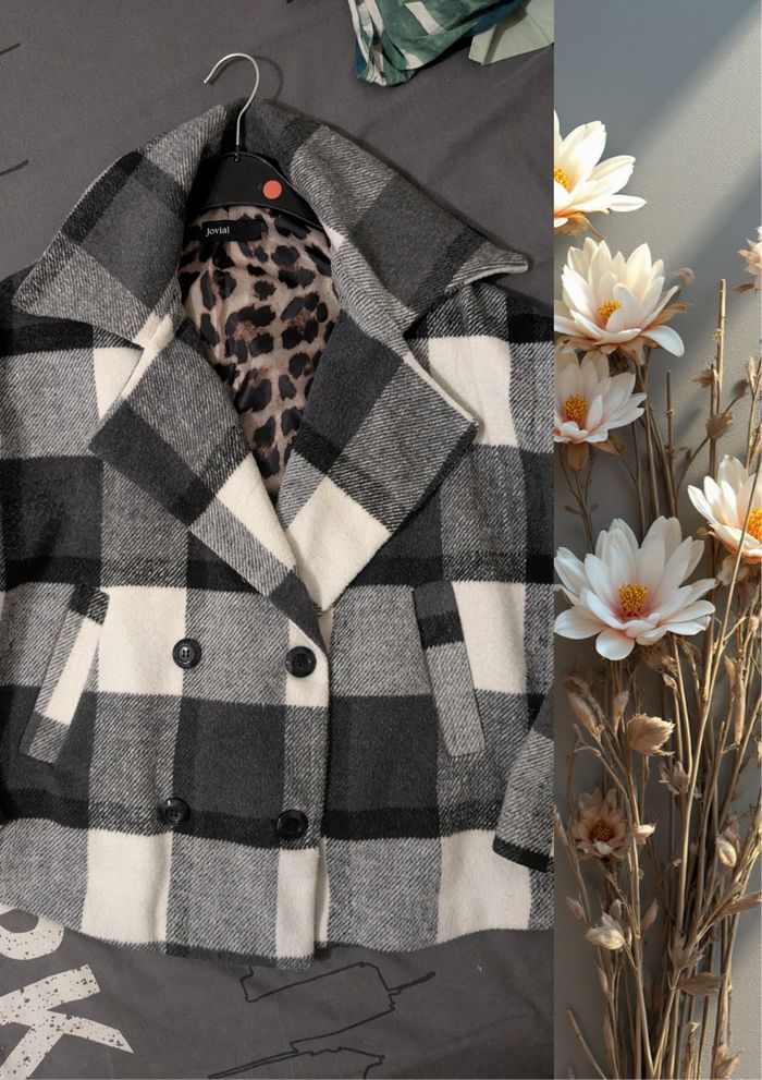 Je vends ce manteau à carreaux Type de produit : Manteau Marque : jovial Taille : M Couleurs : Noir,Gris,Blanc Conditions : neuf sans étiquette ni emballage Acheté 60 €