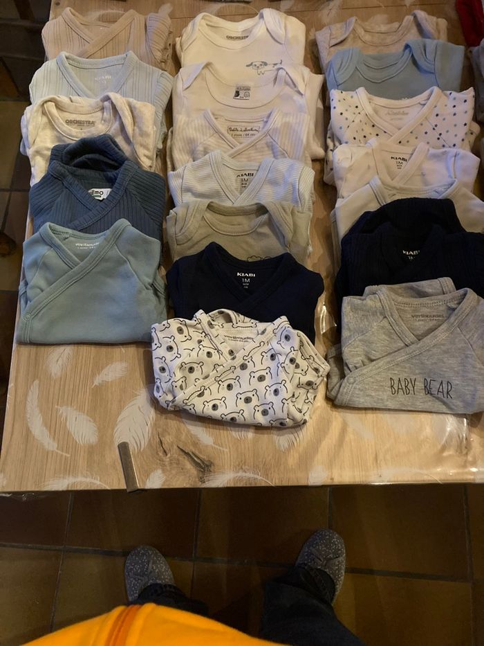 Vends lot vêtements our bébé garçon 1 mois en très bon état ( principalement marque orchestra et kiabi ) composé de : 19 bodies manches longues 2 brassières ( 1 qui a des bouloches ) 9 pyjamas en coton 1 pièce 2 pyjamas en coton 2 pièces 2 ensembles jogging 3 paires de chaussons 1 paire de chaussures IKKS 1 Tee shirt manches longues 1 pull 1 veste Mickey