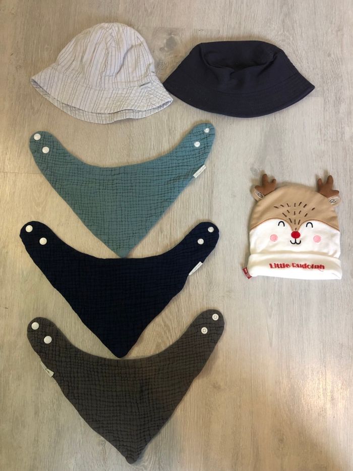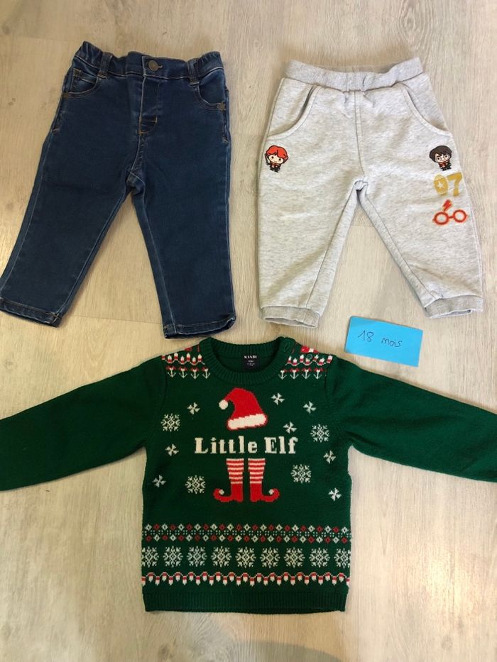 Lot de vêtements bébé garçon du 3 mois au 18 mois : 3 mois : 1 gros gilet boîte à malice 6 mois : un jogging boutchou et un short NPO 9 mois : une salopette gemo, un jogging primark et une polaire boîte à malices 12 mois : une veste obaibi et un jogging NPO 18 mois : 4 bodies manches courtes, 2 tee-shirts manches courtes NPO, 1 jean, 1 jogging Harry Potter, 1 pull de Noël, un maillot de bain. + chaussures tailles 18 et 19 + chaussons 18 + chaussettes + 3 bavoirs + 2 chapeaux et un bonnet de Noël.