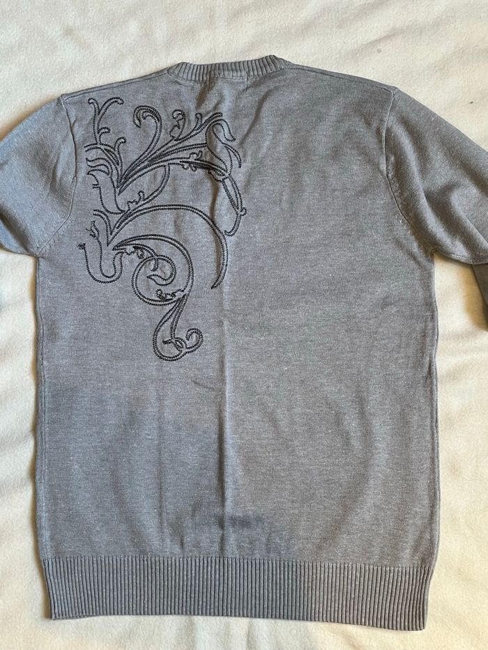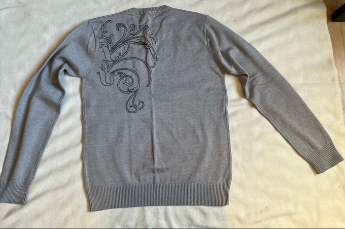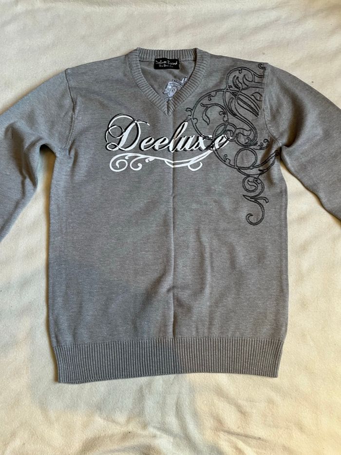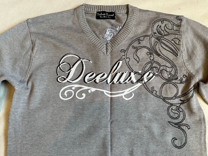 vend ce pull pour garçons couleur grise col V Marque Deeluxe jeans Brand New York City Taille 14 ans 50 % coton, 50 % acrylique Longueur 59 cm demi largeur aux aisselles 44 cm Joli motif sur l’arrière au niveau de l’épaule gauche et sur l’avant au niveau du torse à gauche Écriture Deeluxe en blanc et gris Petit accroc sur le haut de la manche du bras droit 5 euros Mes autres annonces de vêtement pour garçons de 12 à 14 ans #lma42garcon12 #lma42garcon13 #lma42garcon14