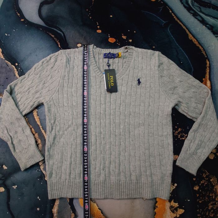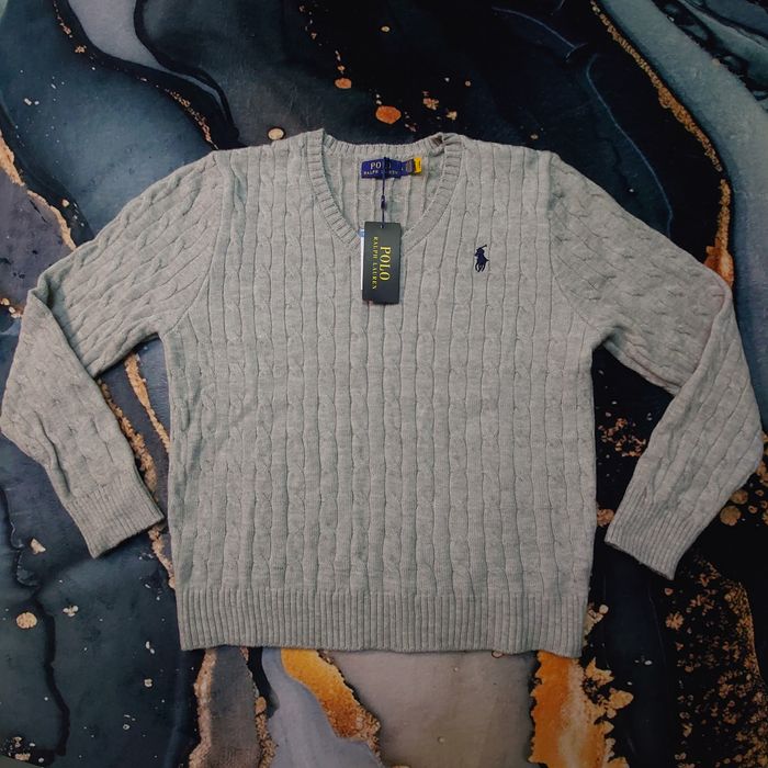 Pull torsadé à col V Ralph Lauren - Taille L - Gris logo brodé noir - Neuf - photo numéro 1