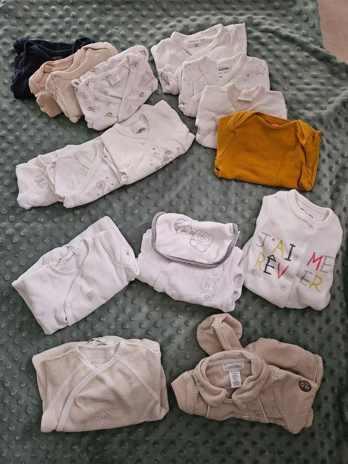 Bonjour je vends un lot de habits naissance très peu utilisé Divers marque (obaibi, boutchou, petit bisous, canari, absorba ...)