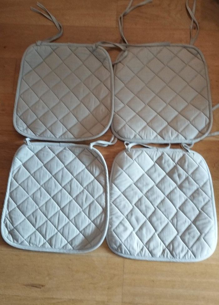 Lot de 4 galettes de chaise de marque IKEA Coussins fins en tissu matelassé, attache avec nouettes Coloris beige gris, teinte pas uniforme Utilisées quelques années, petites bouloches, lavées en machine