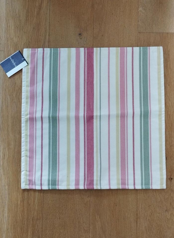 Housse de coussin de marque Madura Coloris écru, rayures style bayadère rose et vert Format 40 x 40 cm Neuf, étiqueté