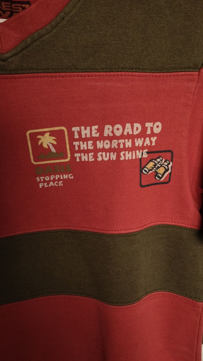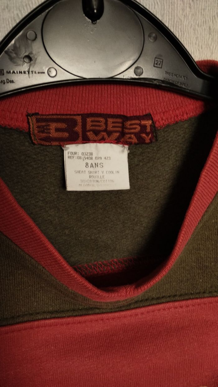 Sweat léger Best Way, taille 8 ans. Couleurs rouge et kaki, col V, motif discret sur la poitrine. Matière souple et confortable, idéal pour la mi‑saison. Aucune tache ni usure visible (voir photos). Étiquette d’origine présente.