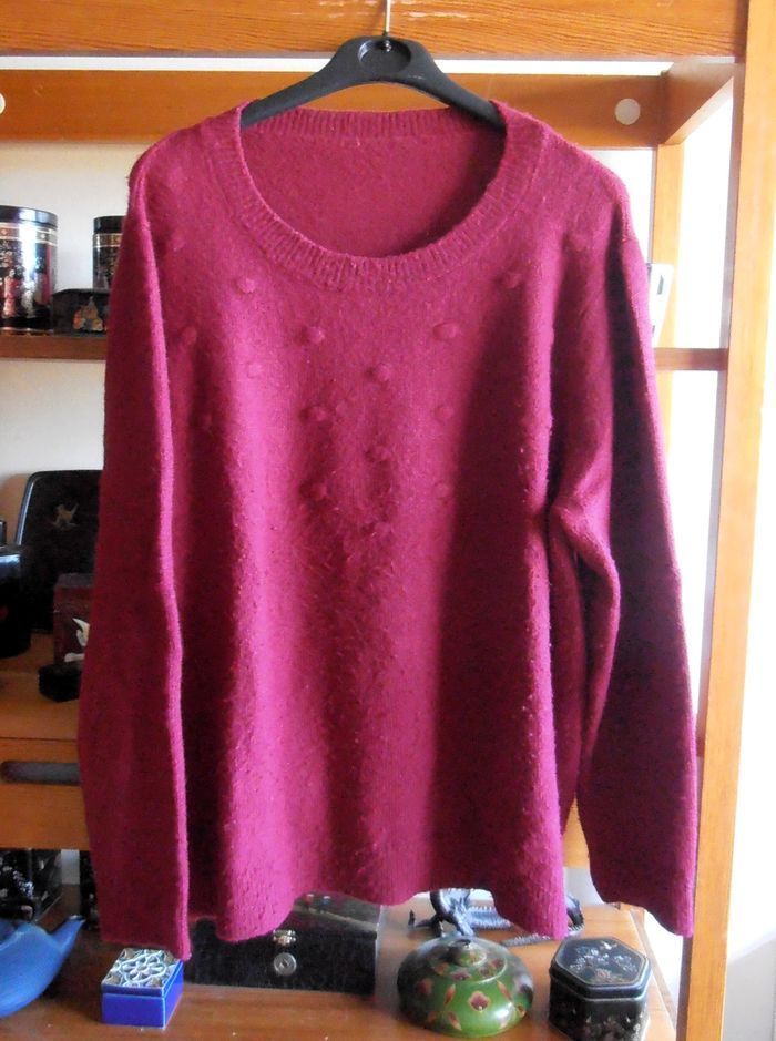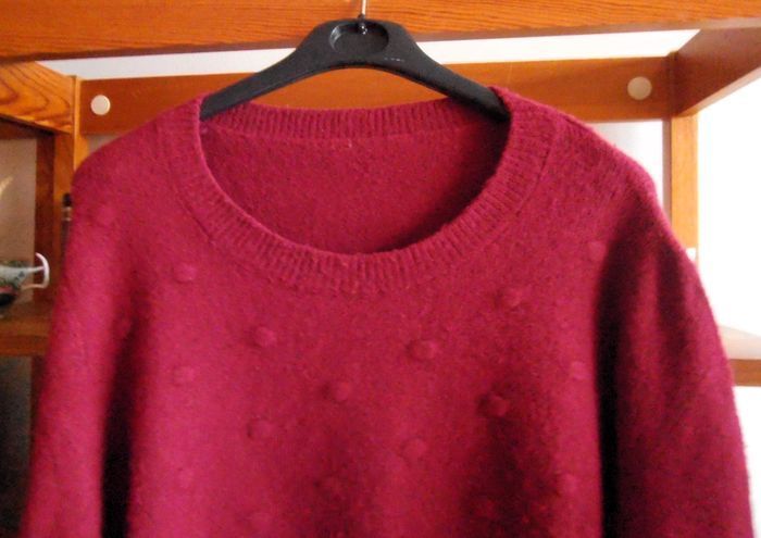 Pull femme, taille XL, couleur rouge bordeaux/prune, jolis motifs en relief "pois ronds", col rond, manches longues. Confortable, doux au touché, très bon état.