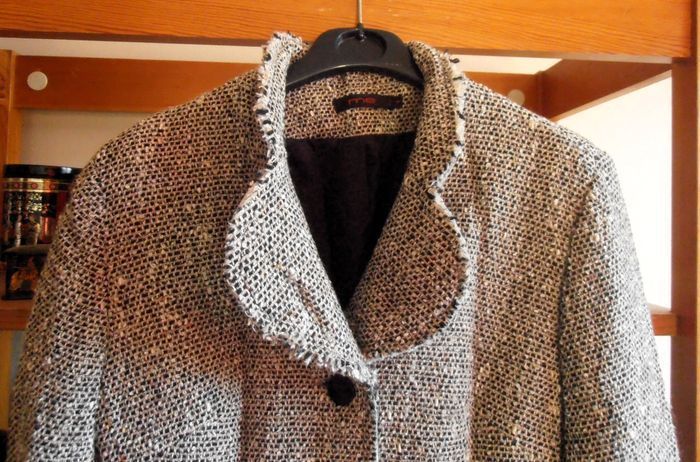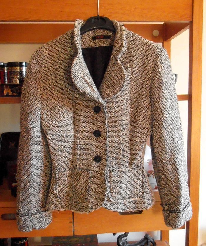 Blazer habillé femme, marque Me (Paris, enseigne haute gamme), taille S 36, couleur mailles blanches et noires (donne un effet de gris), taille cintrée, deux poches, manches longues, rangé de boutons noirs. Epais et chaud. Très bon état. Un style très élégant !
