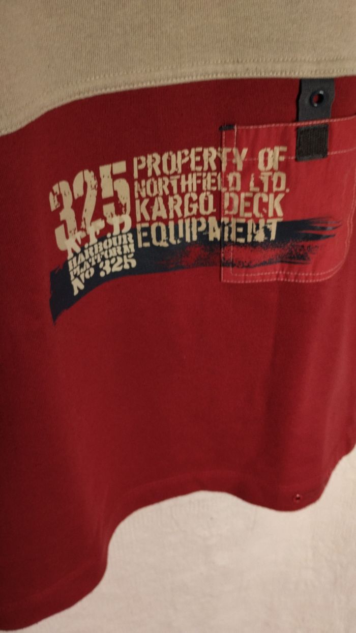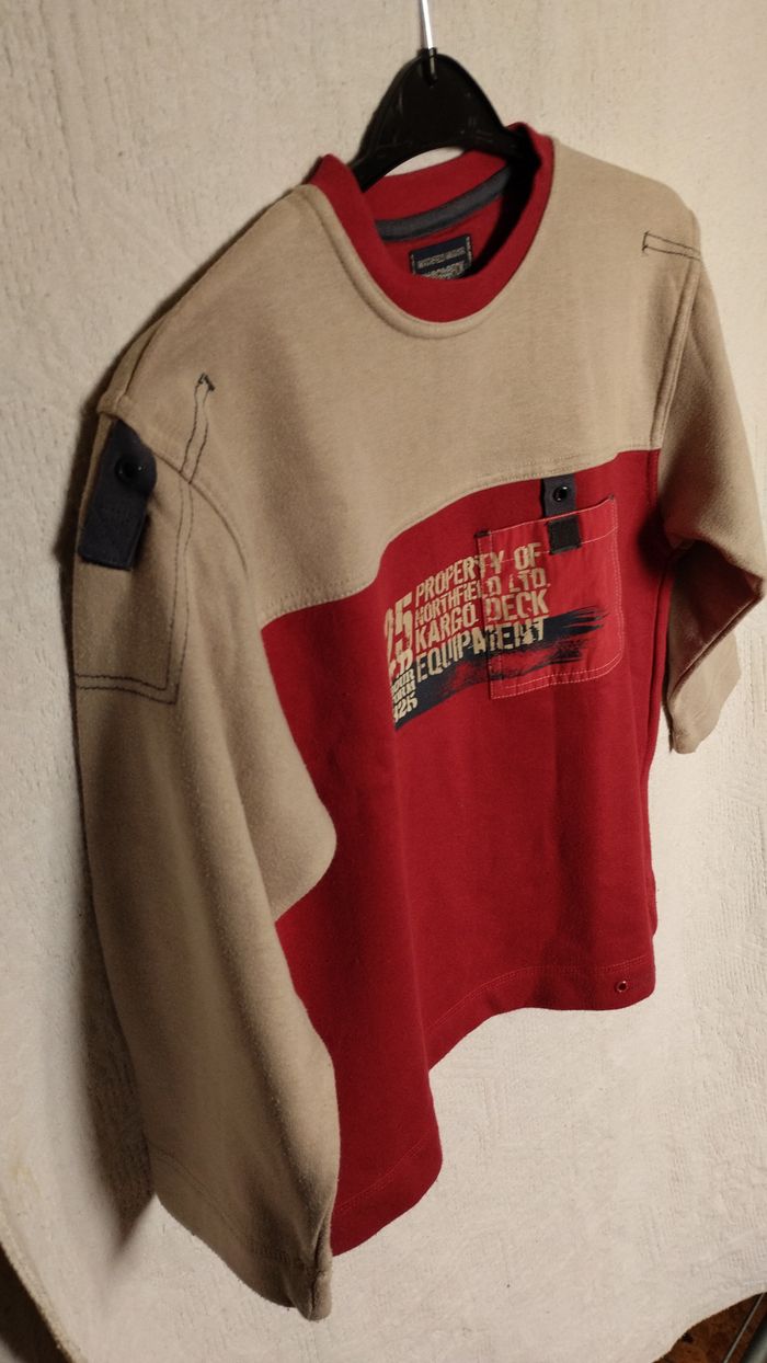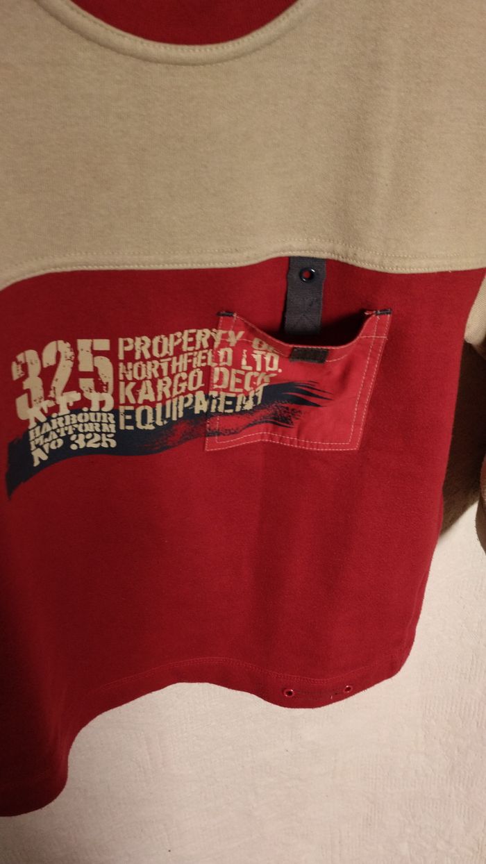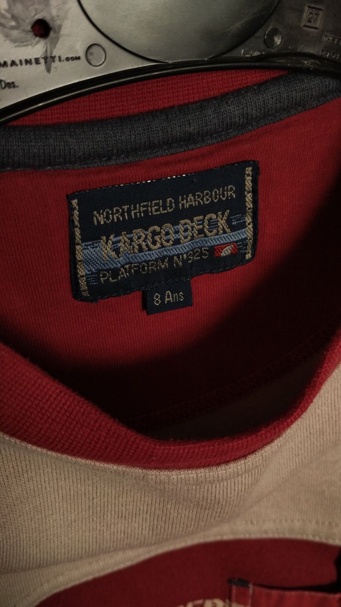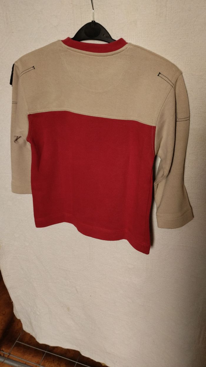 Haut manches longues léger, taille 8 ans. Couleurs beige et rouge, détails boutons aux épaules, petite poche décorative et motif sur la poitrine. Matière souple et confortable, idéal pour la mi‑saison. Aucune tache ni usure visible. Étiquette présente.