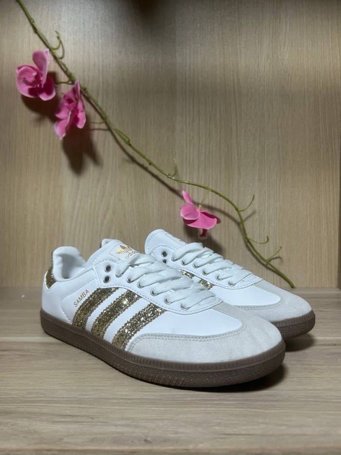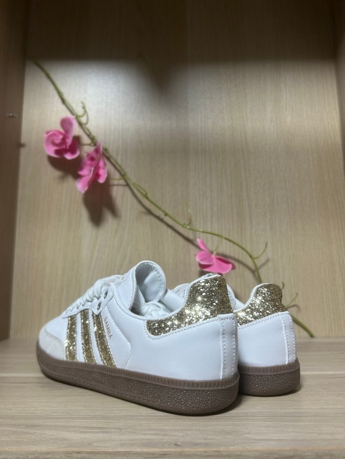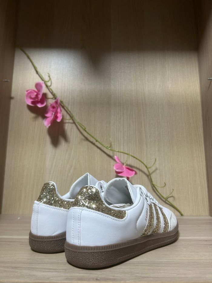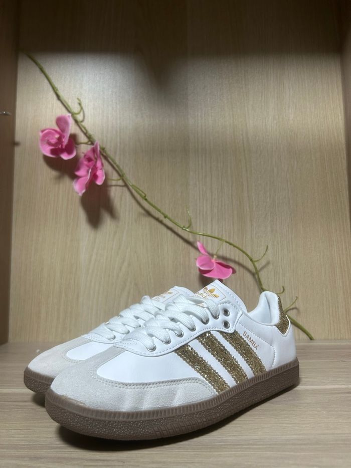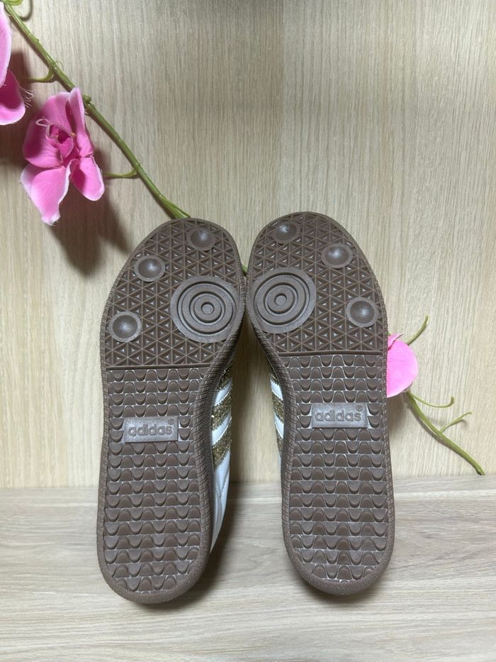 Samba paillette/ Taille 38 Article neuf avec étiquette ✅ Livraison rapide et soigner ✈️ Couleur blanc/doré🎨 Sexe mixte👤 Boite d'origine mais très abîmée ‼️