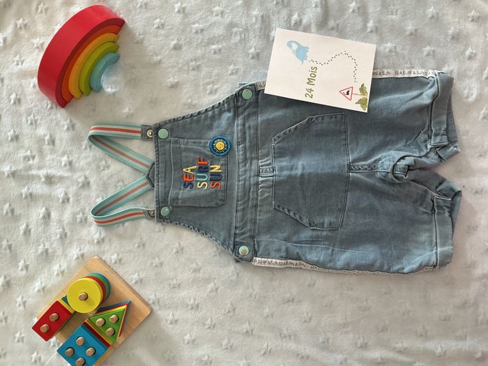salopette short bleu clair pressions entre les jambes poche devant 24 mois mots d'enfants - photo numéro 1