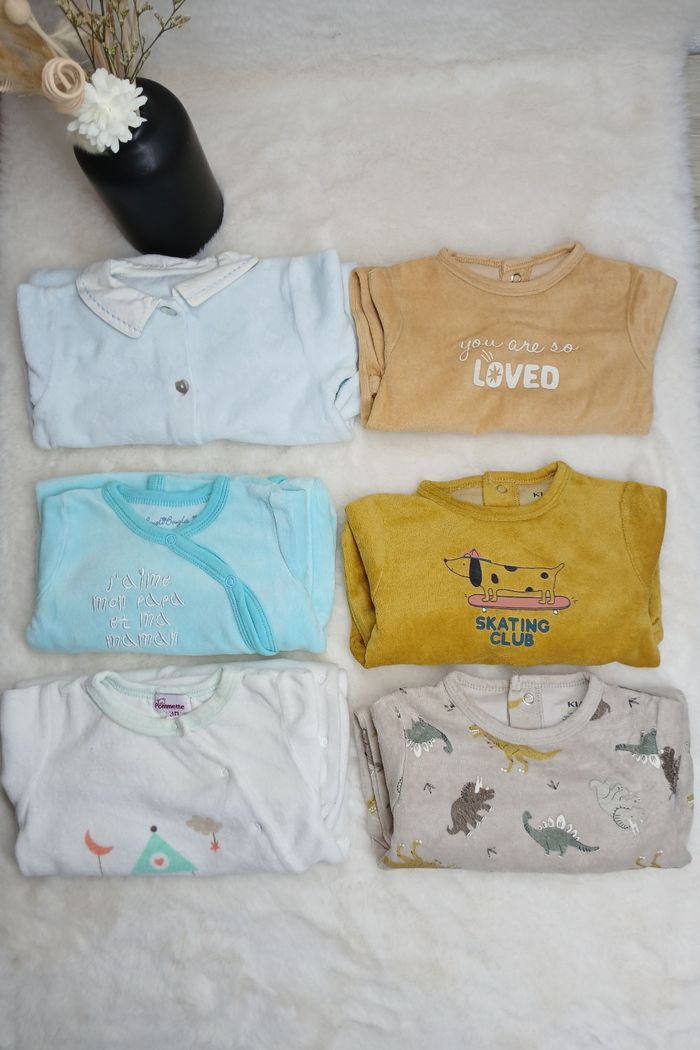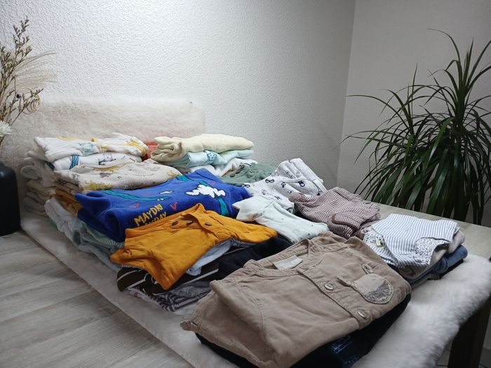 70 pièces. 0 à 9 mois 34 pyjamas 20 pantalons 14 hauts/vestes 1 caban 1 salopette Tout est en très bon état. Marques : Tape à l'œil, DPAM, Sergent Major, Jacadi, kiabi, h&m, orchestra, sucre d'orge, vertbaudet, Obaïbi, zara, gemo..