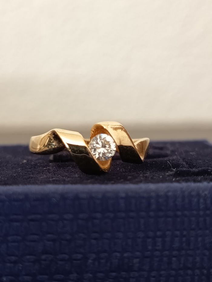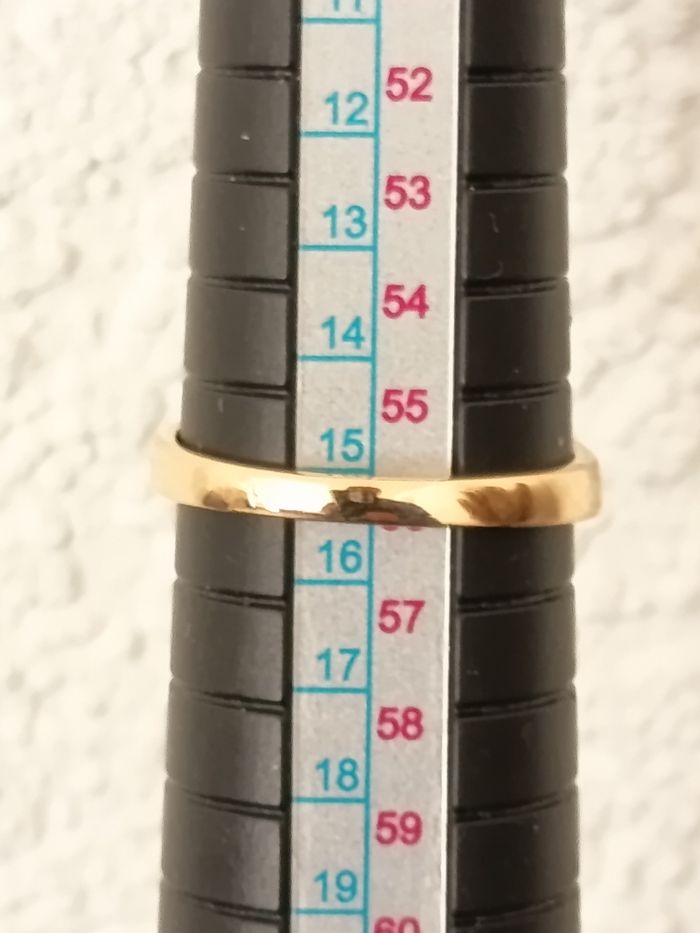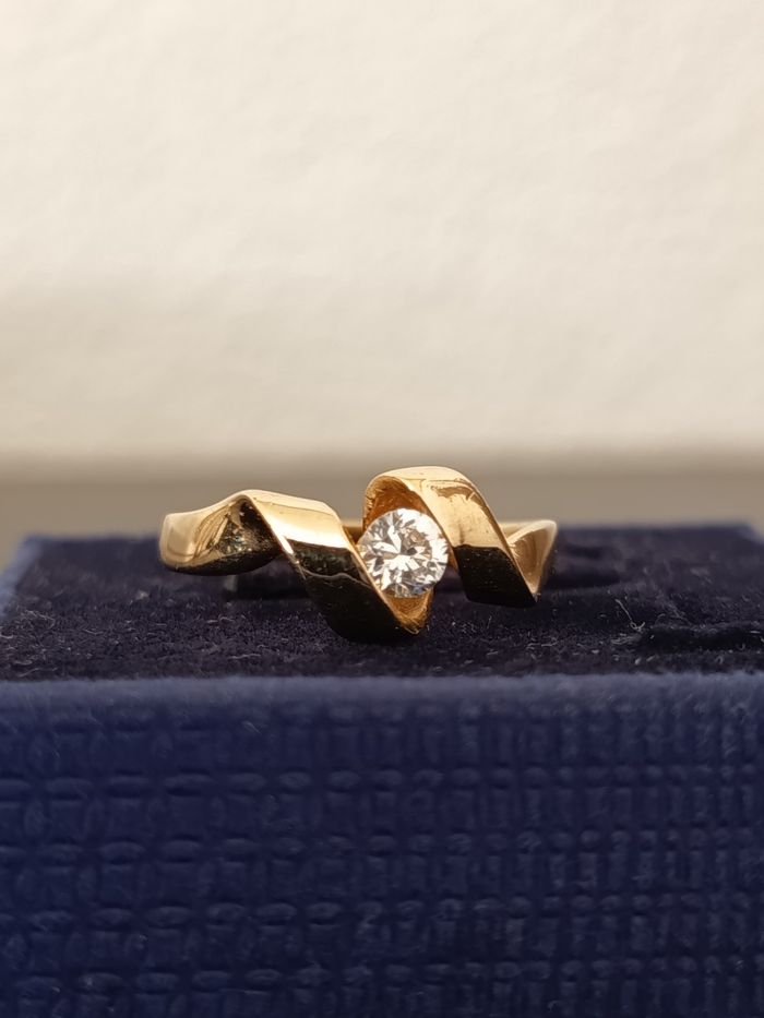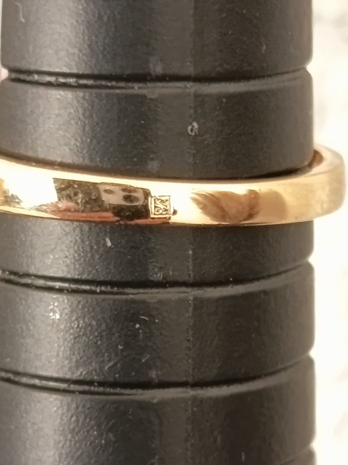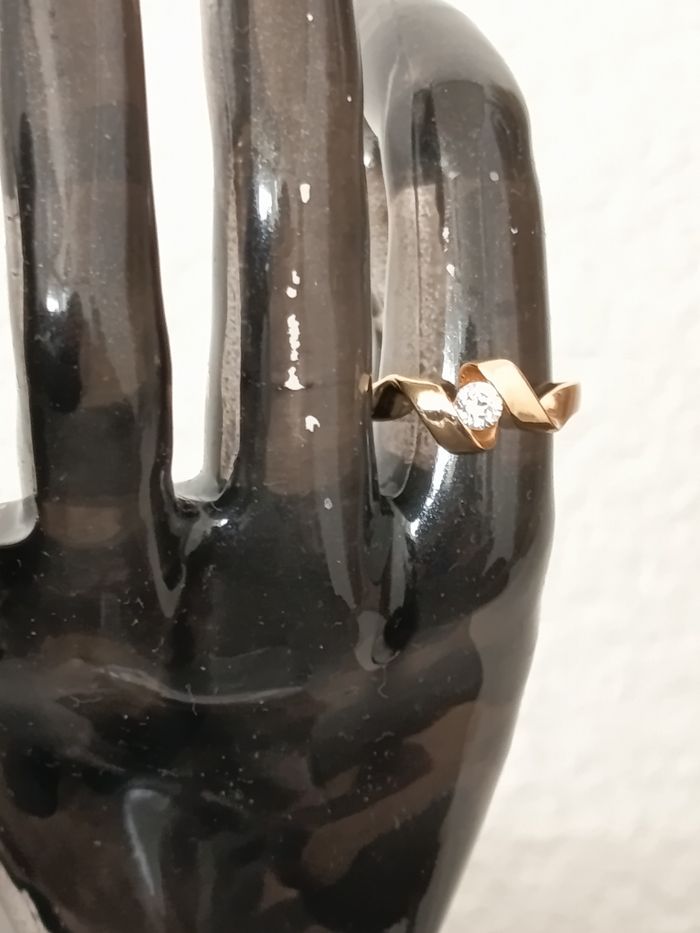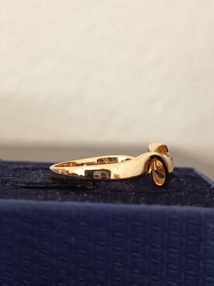 Bague plaqué or ornée d'un zirconium blanc au centre. Taille 56. Poinçonnée. Très bonne état.