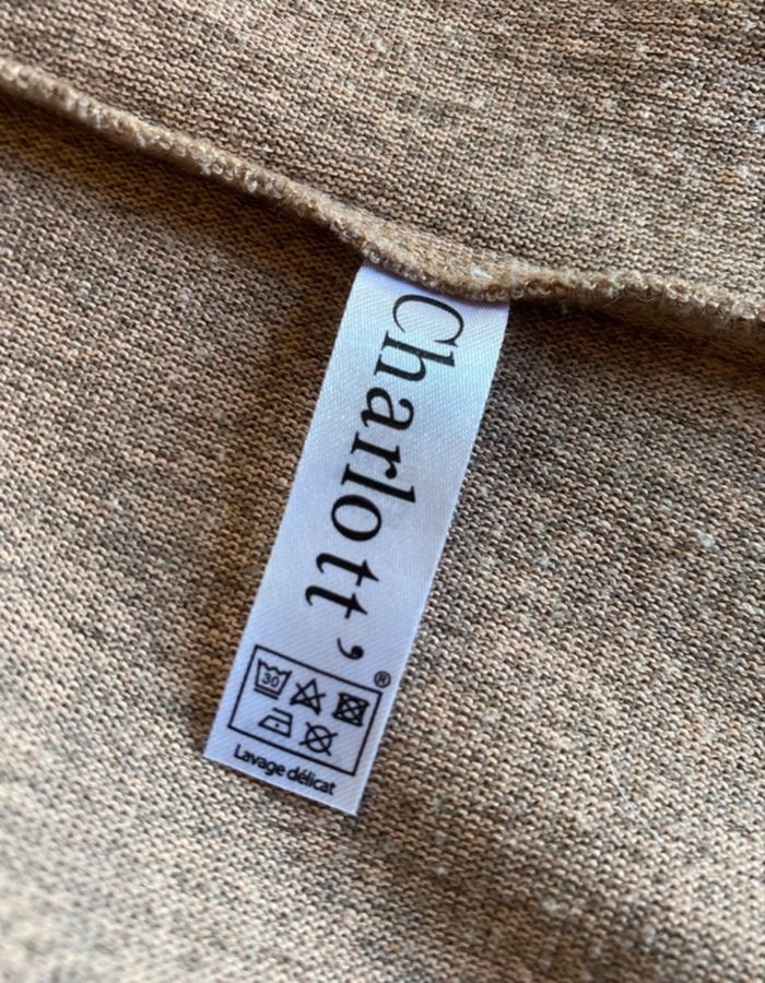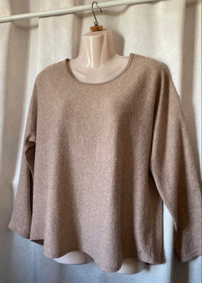 Pull beige mousseux 38/40 Charlott' Pas de carrure car pas de couture aux épaules, envergure 151 cm Aisselle à aisselle 54 cm Longueur devant 60 cm, plus long derrière avec une forme arrondie Liquette 95% polyester 5% elasthane