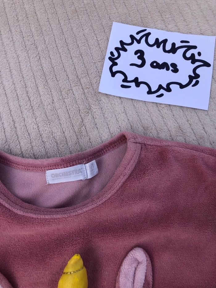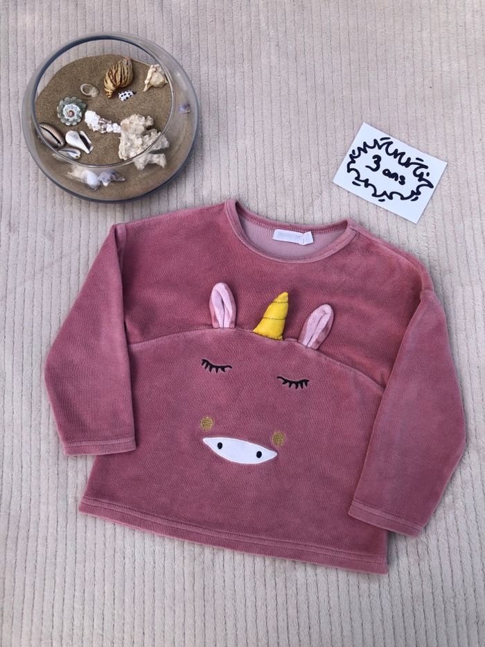 Pyjama en velours, deux pièces, motif licorne, 3 ans (98 cm), bon état (les motifs au niveau des genoux sont légèrement estompés et la corne de la licorne a perdu son côté pailleté - cf photo), vêtement de premières mains, Orchestra. 🛍 Dressing trié par taille, les catégories sont accessibles à partir de mon profil ! Bon shopping ! #fille3ansnikita40000