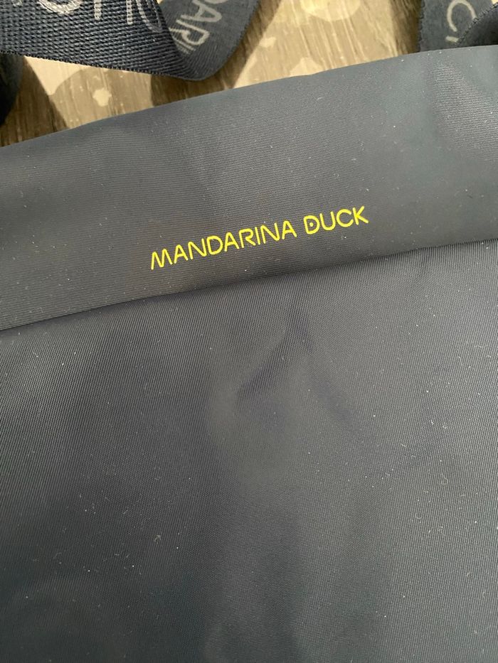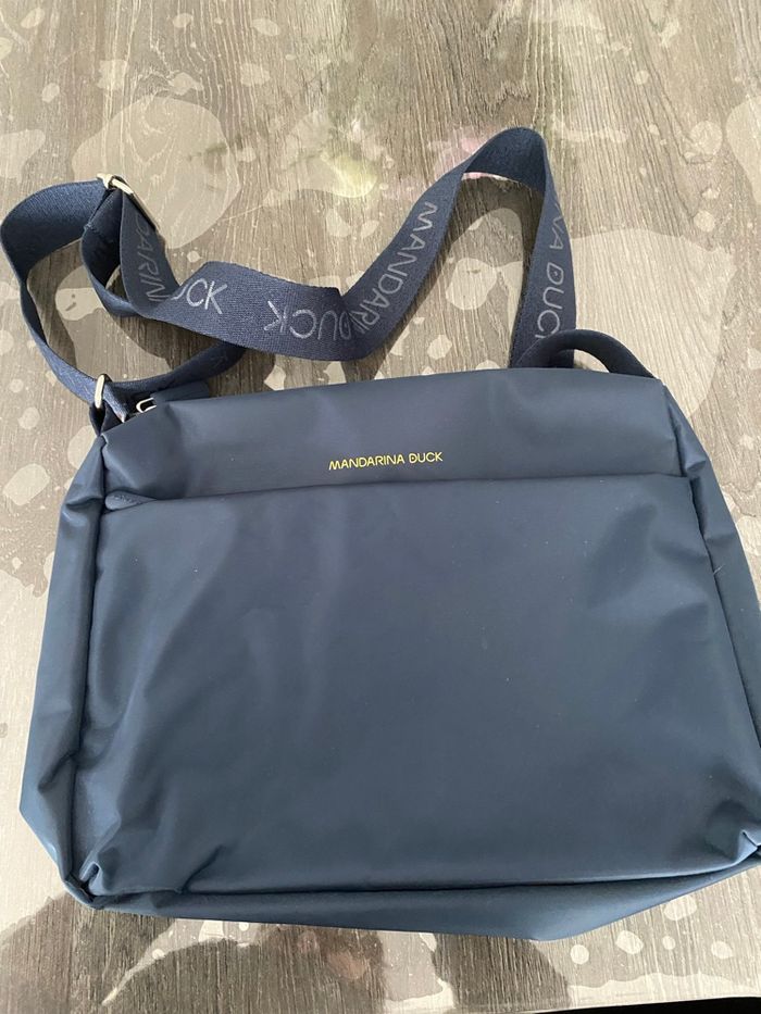 • Nylon lisse bleu marine • Logo Mandarina Duck doré discret à l’avant • Bandoulière large logotypée • Intérieur avec motif géométrique typique MD • Double compartiment zippé