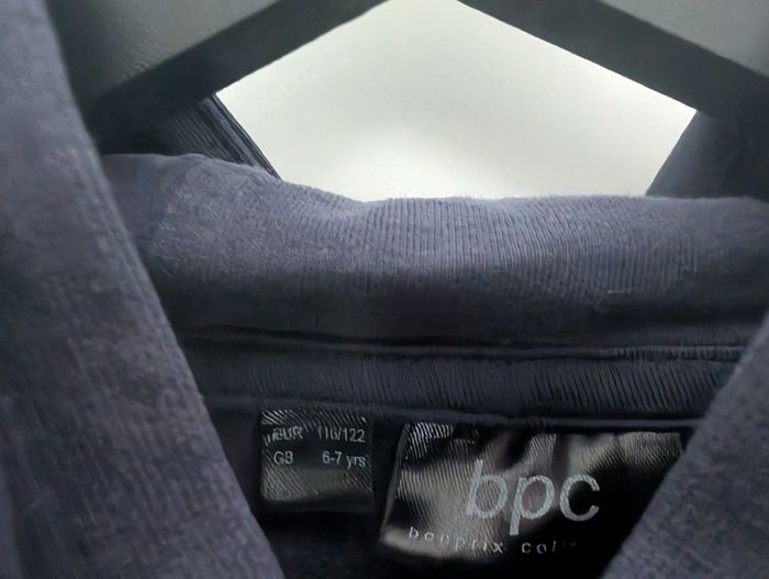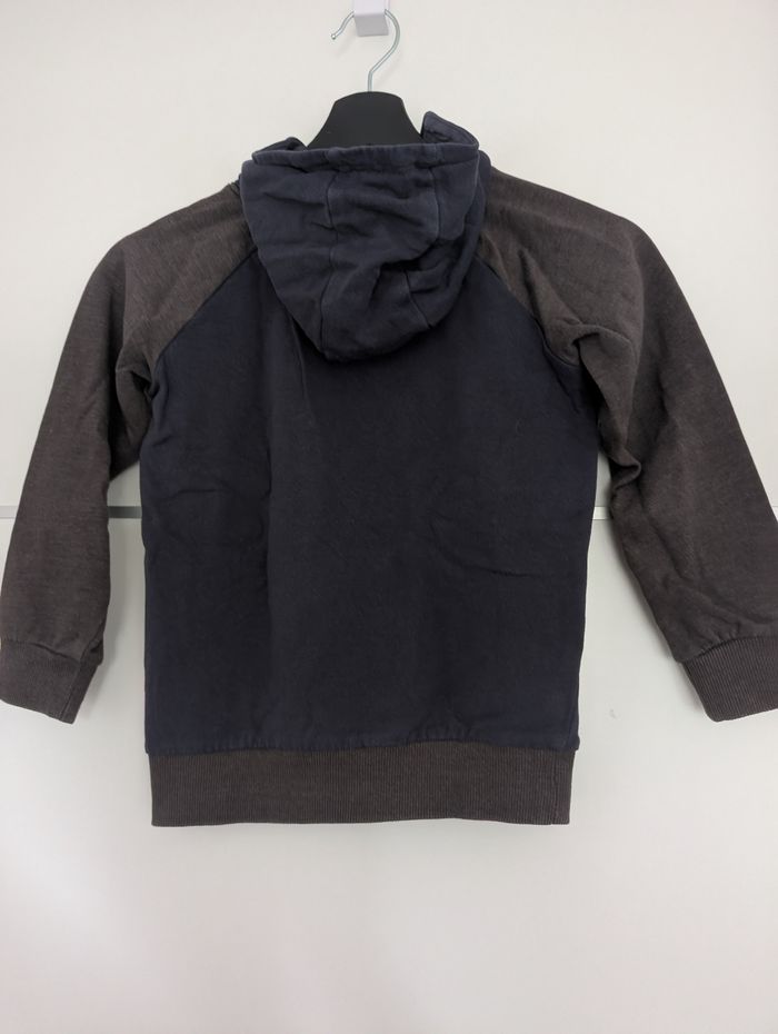 Sweat à capuche parfait pour la période de Noël et les fêtes de fin d'année ! Grand motif central d'un renne souriant avec un nez rouge, portant un bonnet et une écharpe rouges. Le message est "HAPPY X-MAS!". Manches sont d'une couleur contrastée (gris/taupe) par rapport au corps (bleu marine/nuit), ce qui donne un look sportif et décontracté. Marque : BPC Bonprix Collection. Taille 6-7 ans.