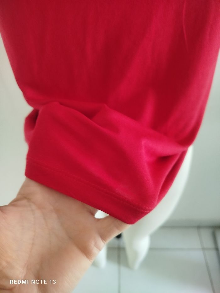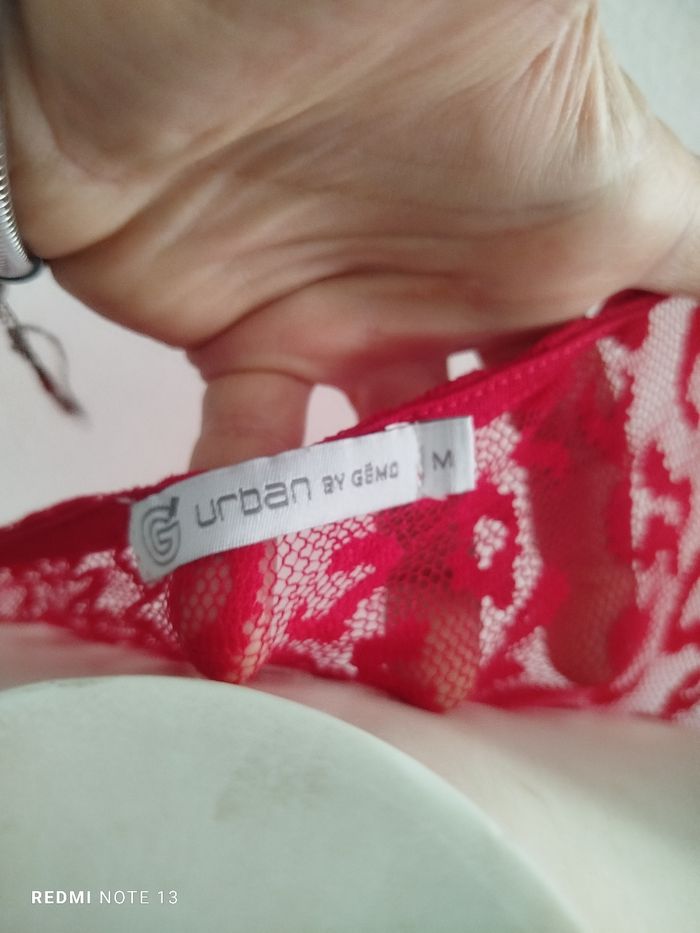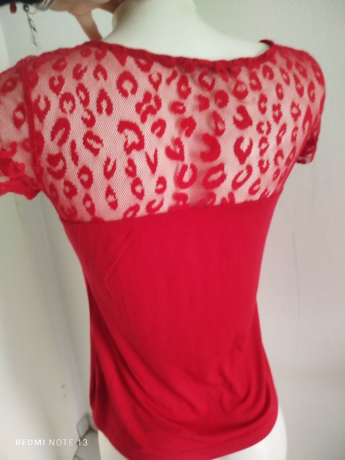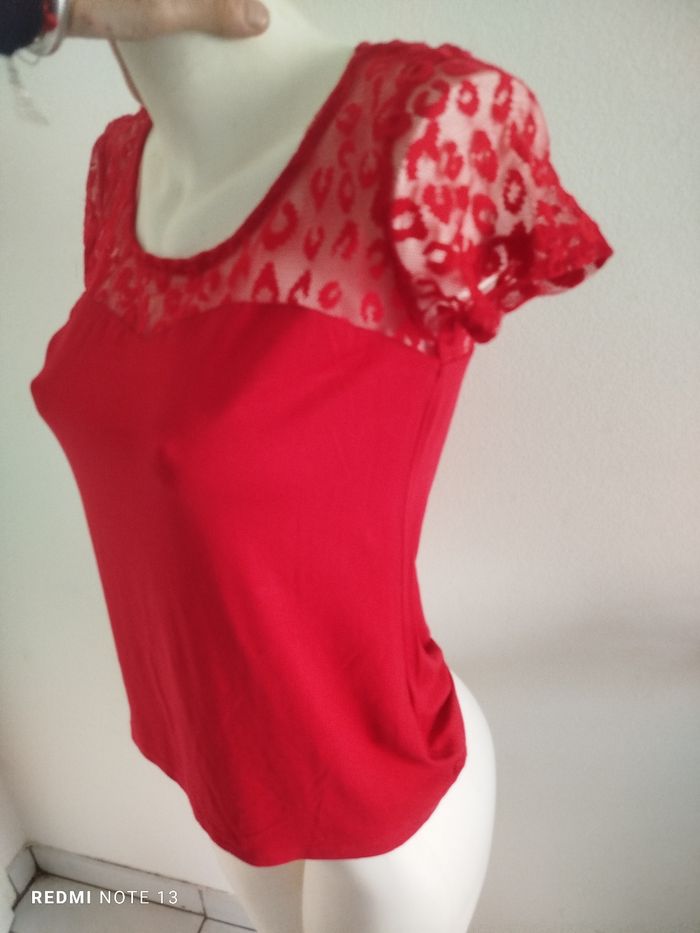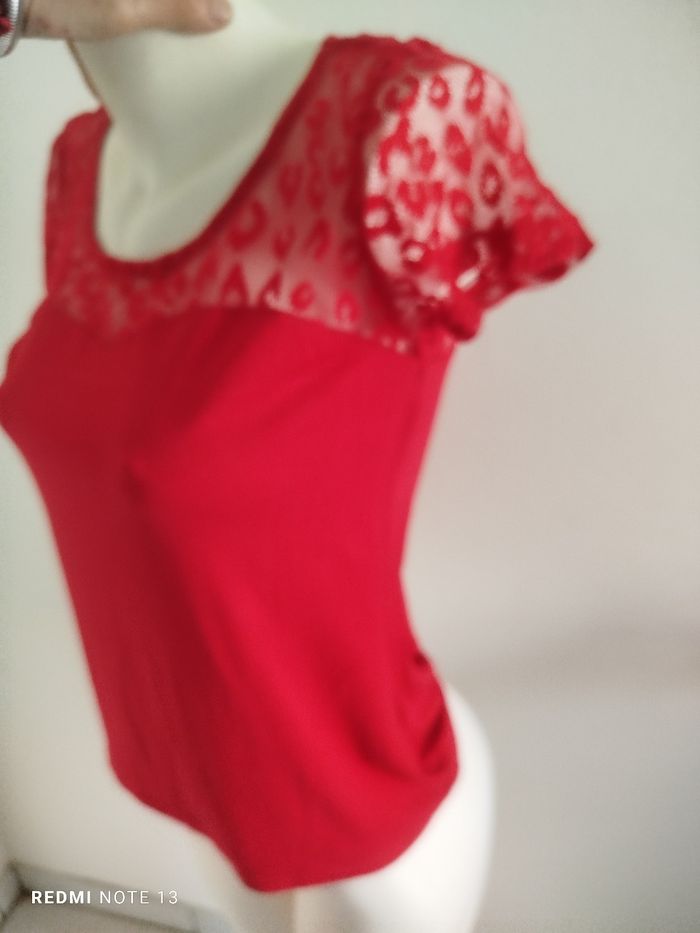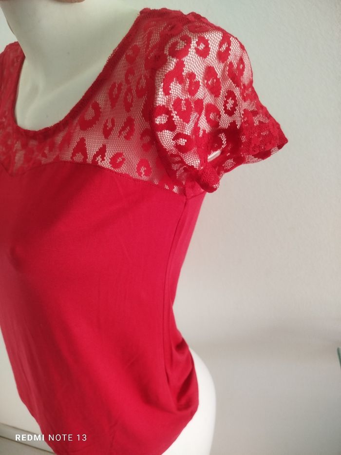 #kytieMfemme. Tee-shirt manches courtes M de marque urban Gémo Puy des souples élastiques en dentelle col rond de couleur rouge mesure des épaules 38 cm des aisselles 42 hauteur 60 en état neuf en polyester élastique et en coton en état neuf ref 5062