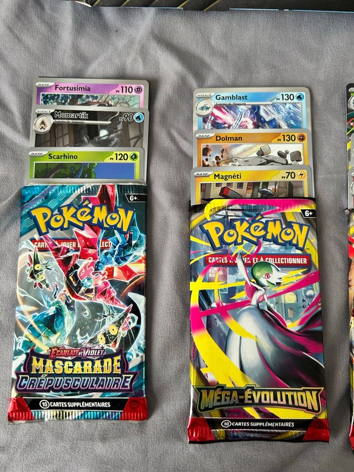 Coffret Mega Kangourex Ex reconditionné 4 boosters (2 ME1, 1 EV9 et 1 EV6), 2 hits (1 carte ex Mega Florizarre et 1 Ar Momartik), 3 holos, 7 reverses, 4 énergies et 4 cartes code + les cartes promos du coffret Booster et coffret non recollé, idéal cadeau pour enfant