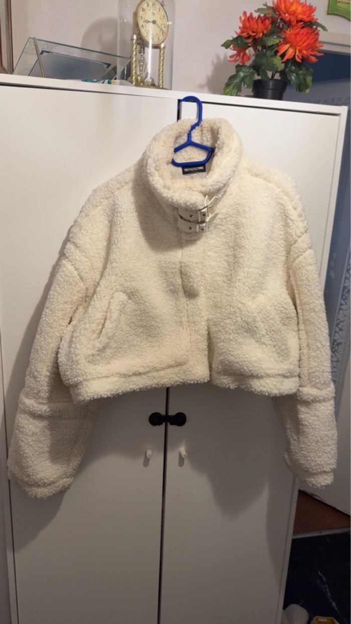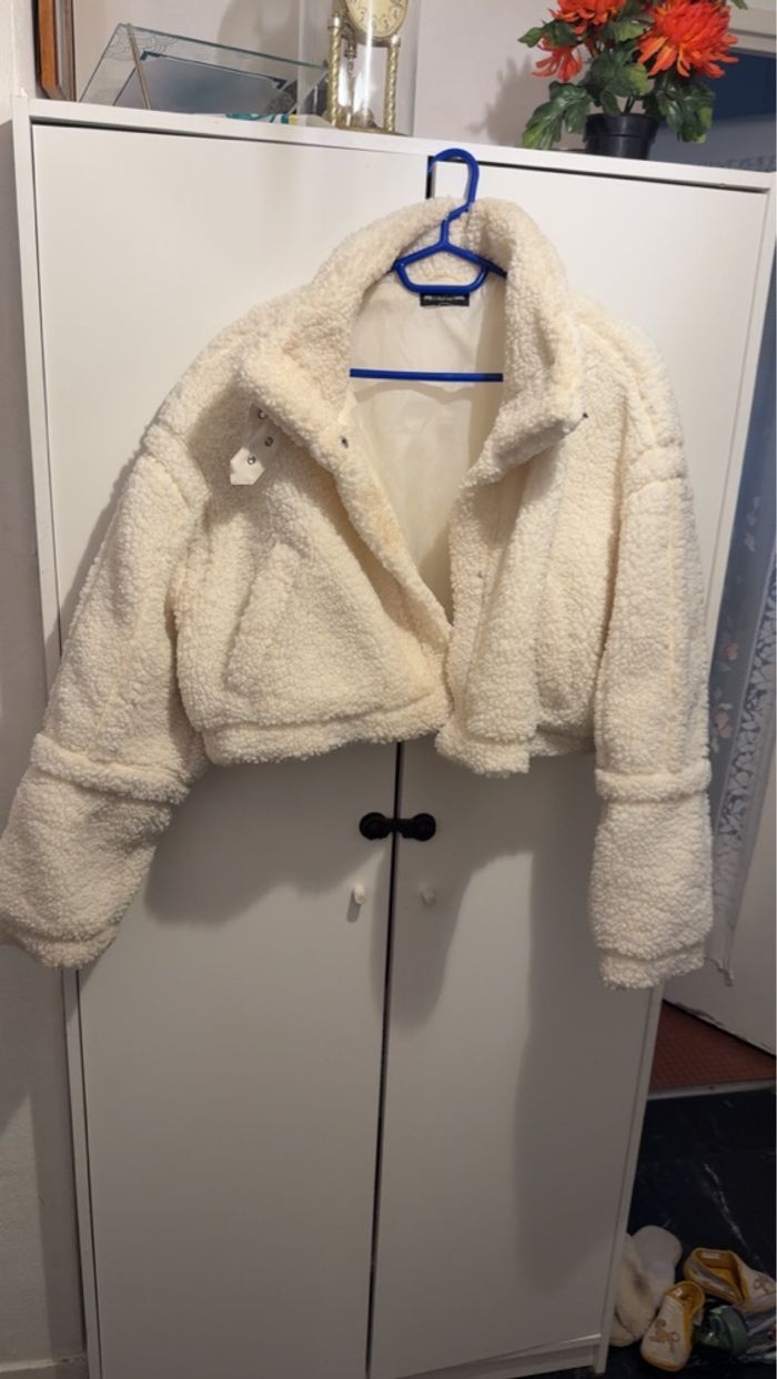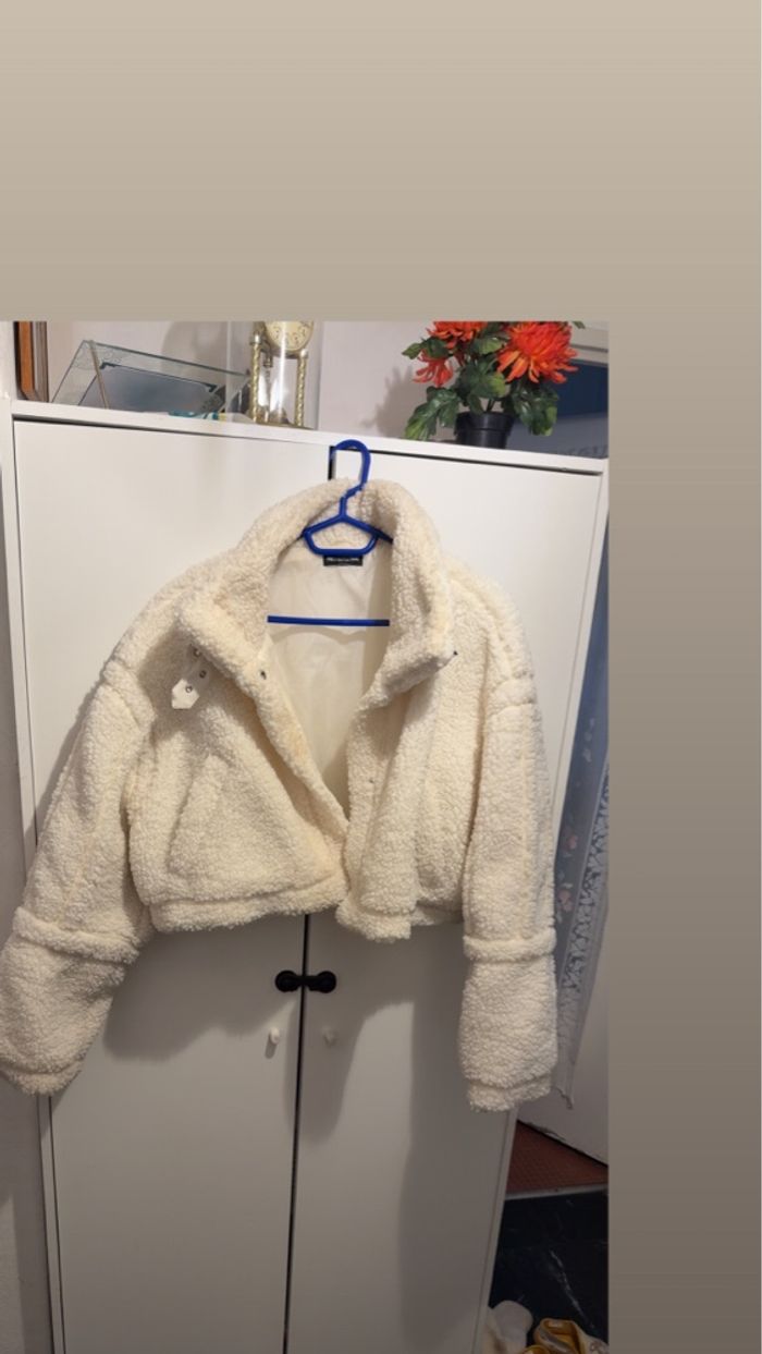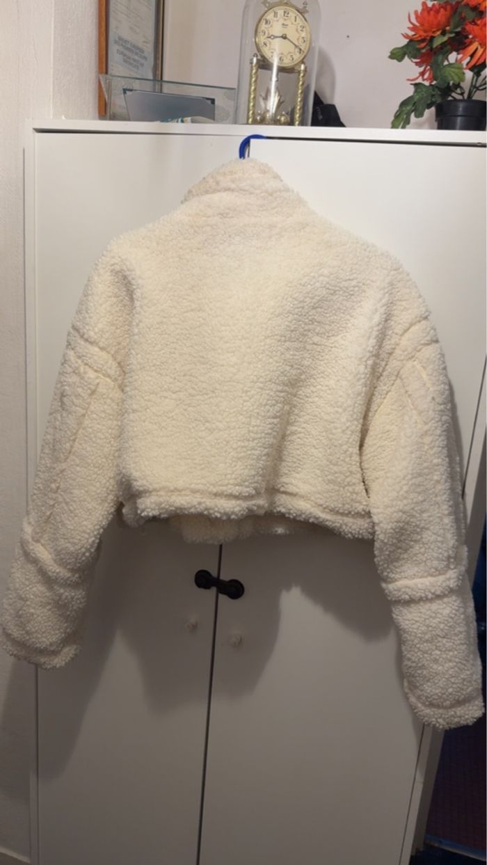 Manteau court en simili fourrure de mouton frisé. Couleur crème en très bonne état.