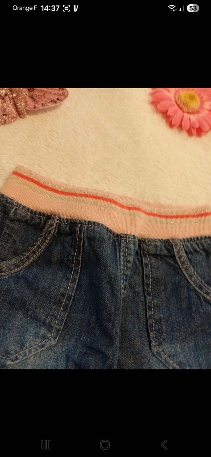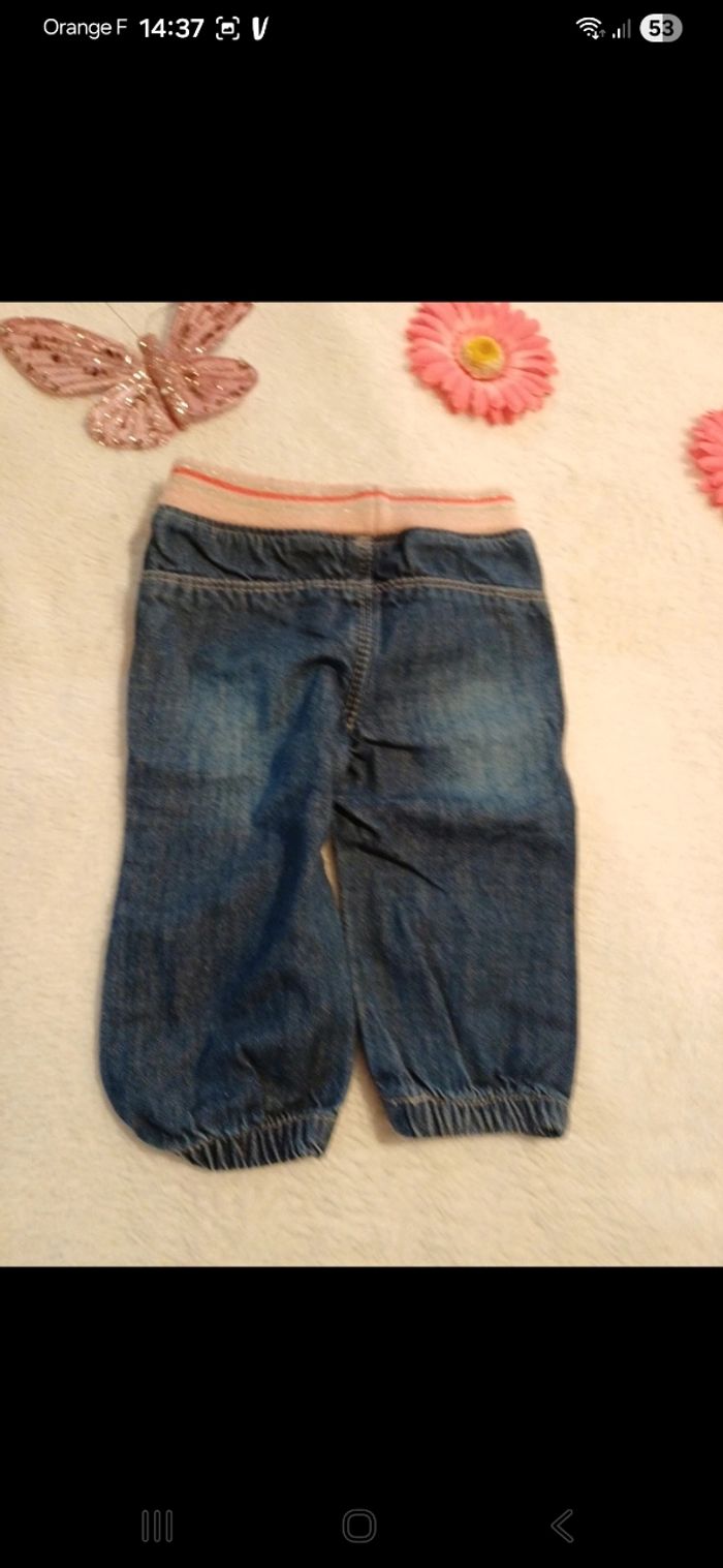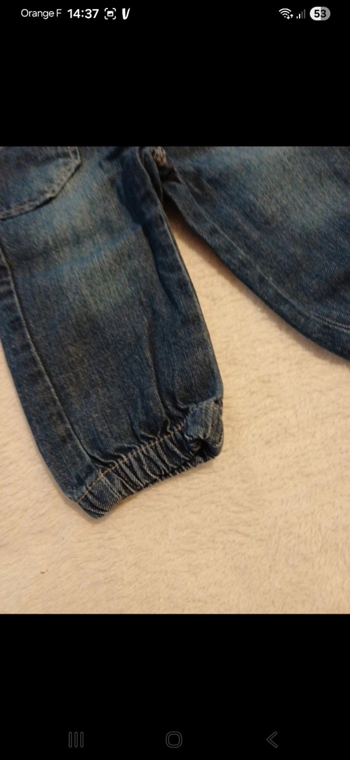 Jean elastiqué à la taille et aux chevilles. Bouloché au niveau de la ceinture.