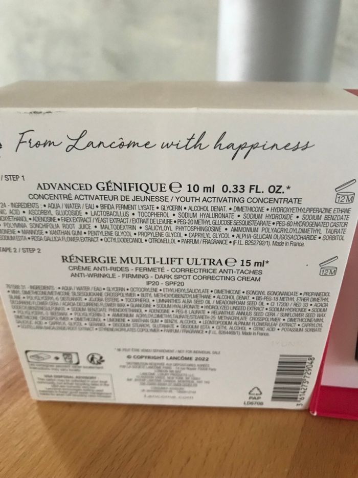 Coffret Lancôme soins visage 1 Advanced génifique Concentré activateur de jeunesse 10 ml 1 Rénergie multi lift ultra Crème anti rides fermeté correctrice anti tâches 15 ml Neuf