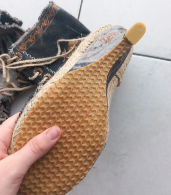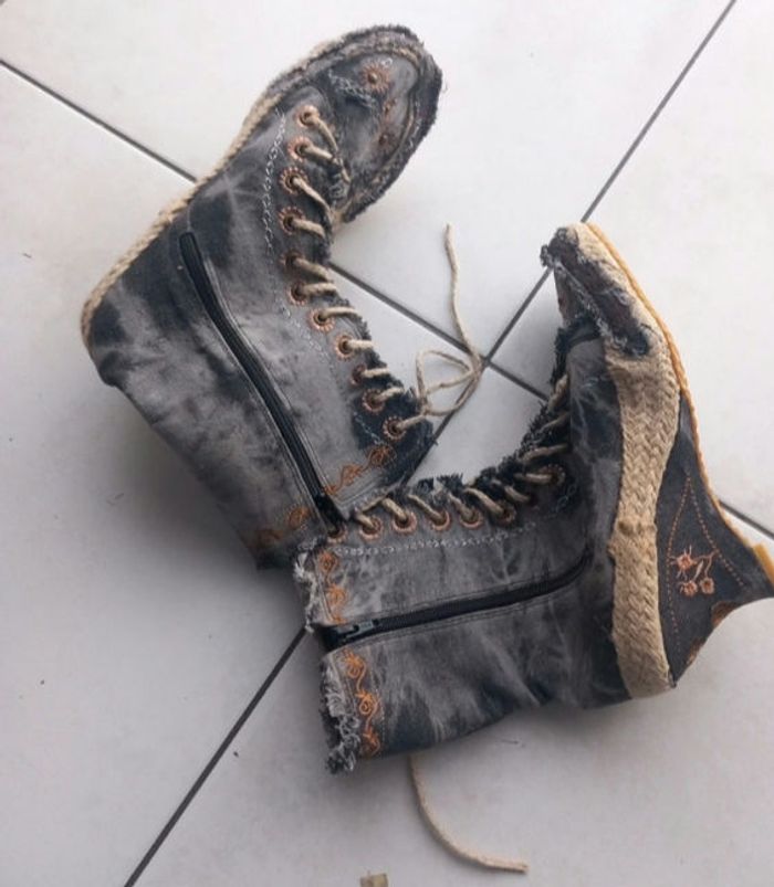 Vends bottines noir Taille 40 Décors fleurs brodées Attention couleur noir jean délavé Sur tige et sur talon Jamais porté