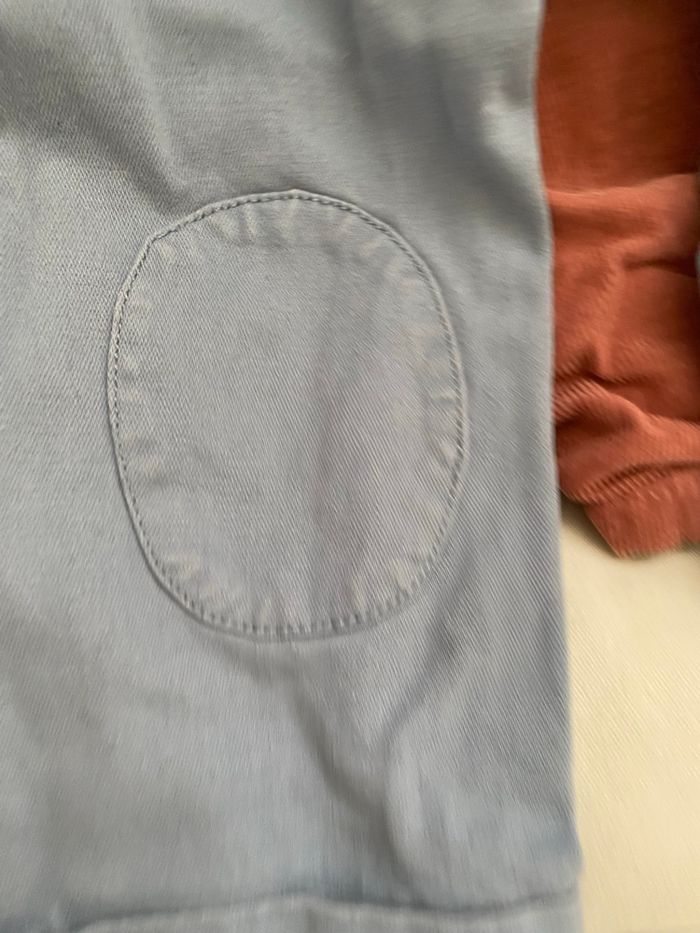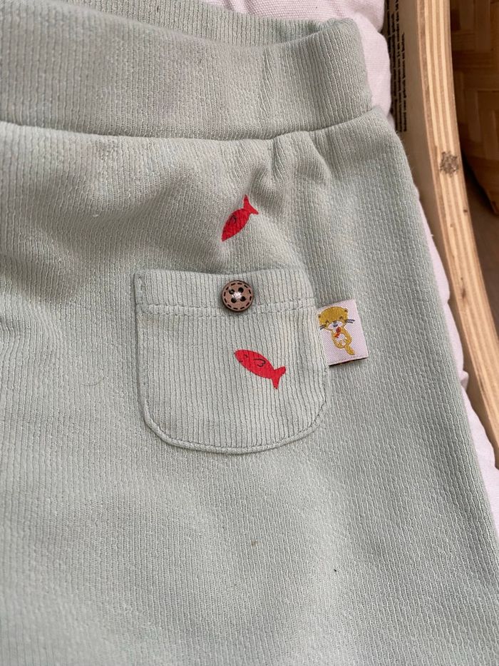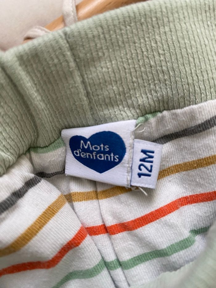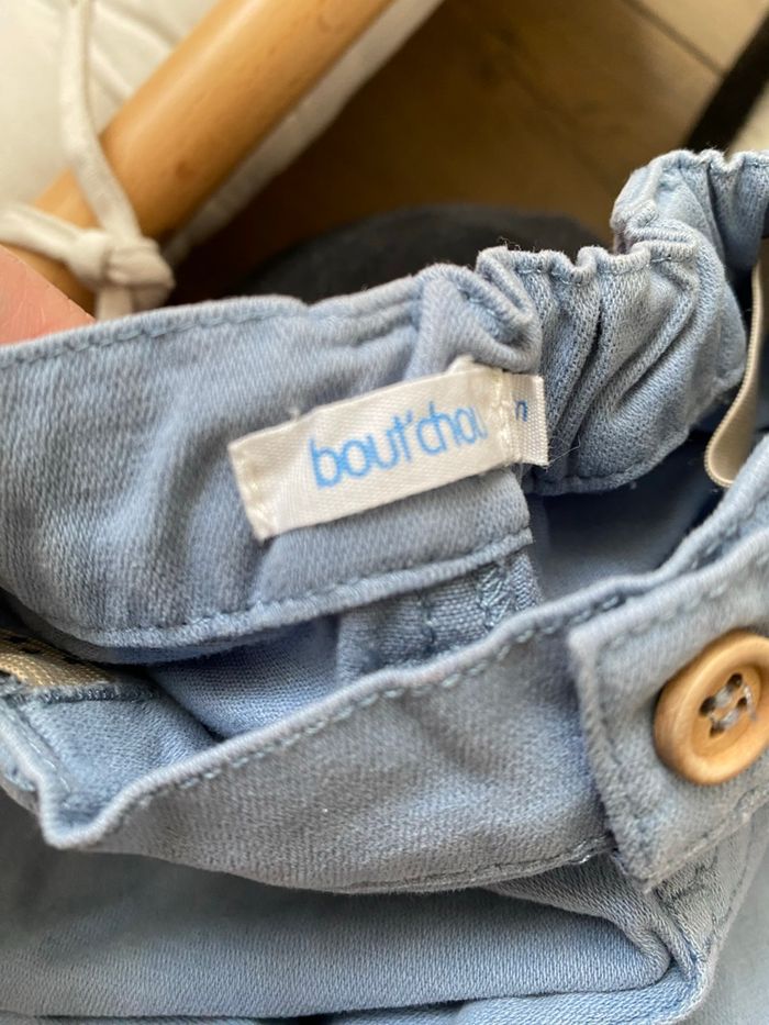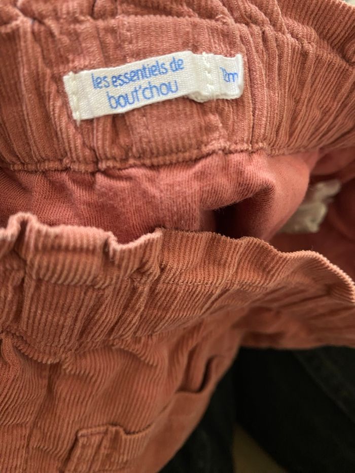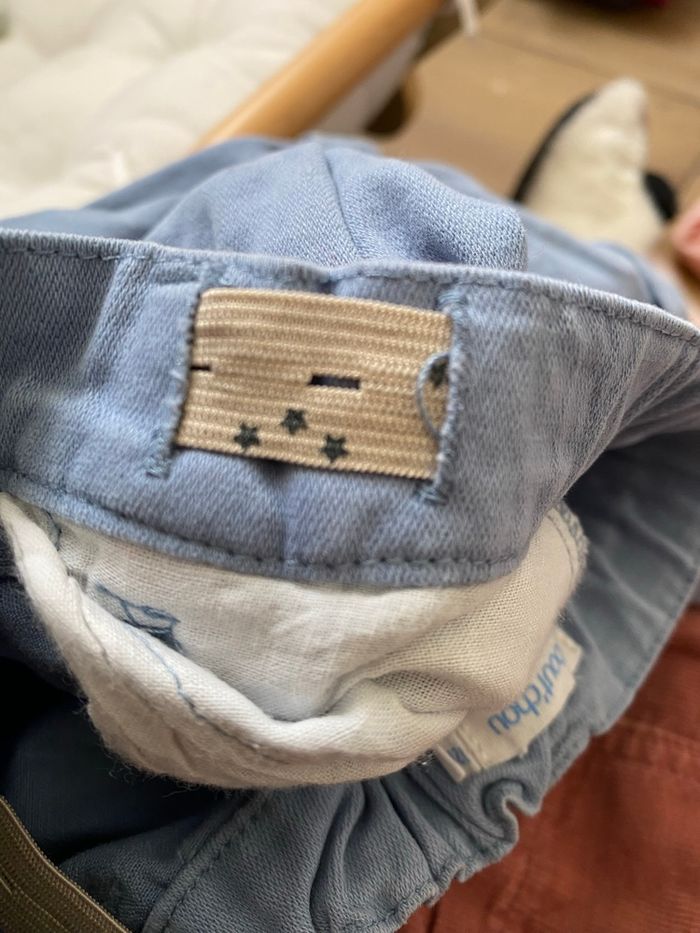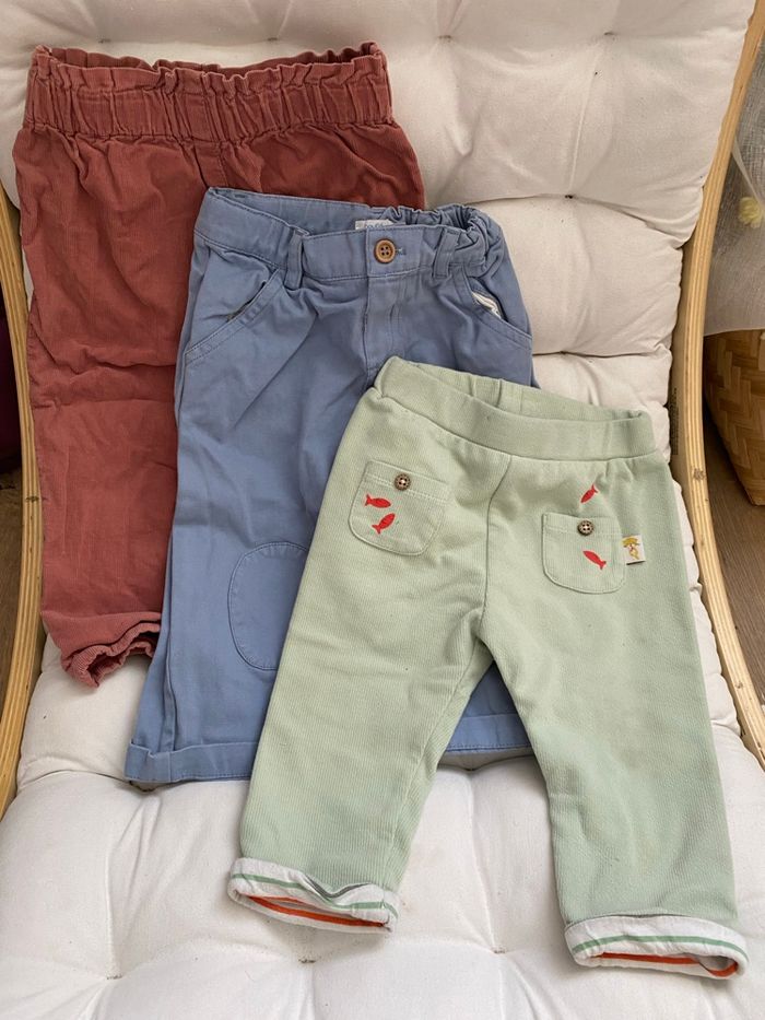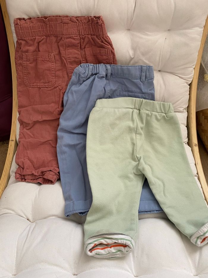 Lot de 3 pantalons mixtes Il manque un bouton pour l’élastique du pantalon bleu .