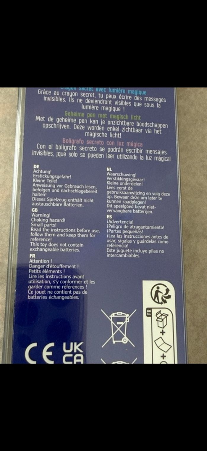 Tout neuf. Stylo secret avec lumière magique. On peut écrire des messages invisibles. Ils ne deviendront visibles que sous la lumiere magique ! 2 de dispos. Encore plein de choses à mettre dans mon dressing. N'hésitez pas à vous abonner et à lire mon profil. 😉