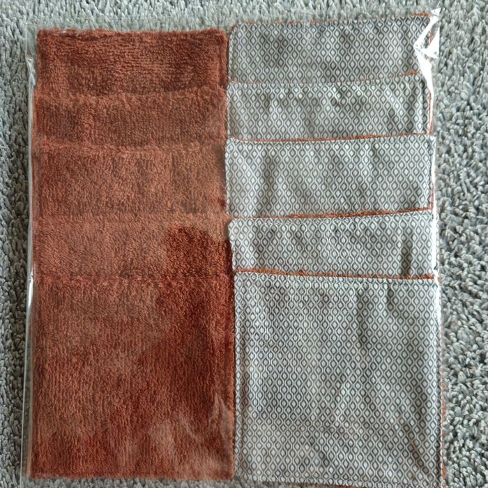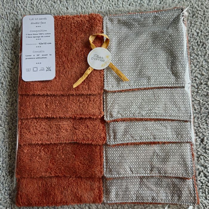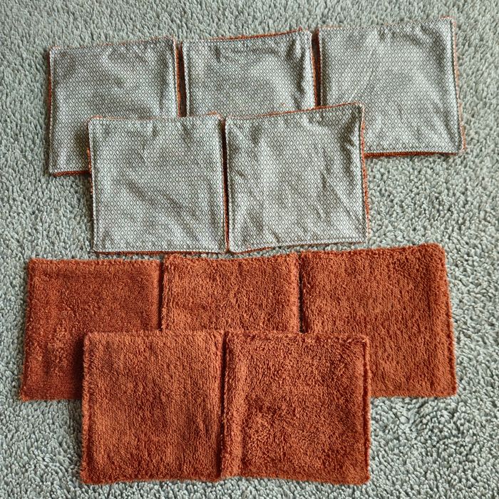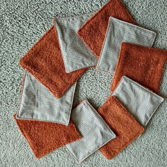 Lot 10 lingettes double face un côté tissu 100%coton motif géométrique et un côté éponge de coton brique lavables jusqu'à 60 degrés Passage au sèche linge sans soucis Taille 12x12 cm Neufs jamais utilisés Réduction pour l'achat en lots 20% pour 2 30% pour 3 40 % pour 4 45% pour 5 N'hésitez pas à me contacter 🙂