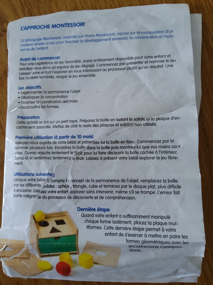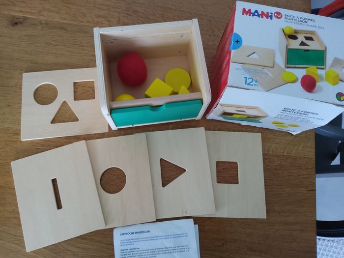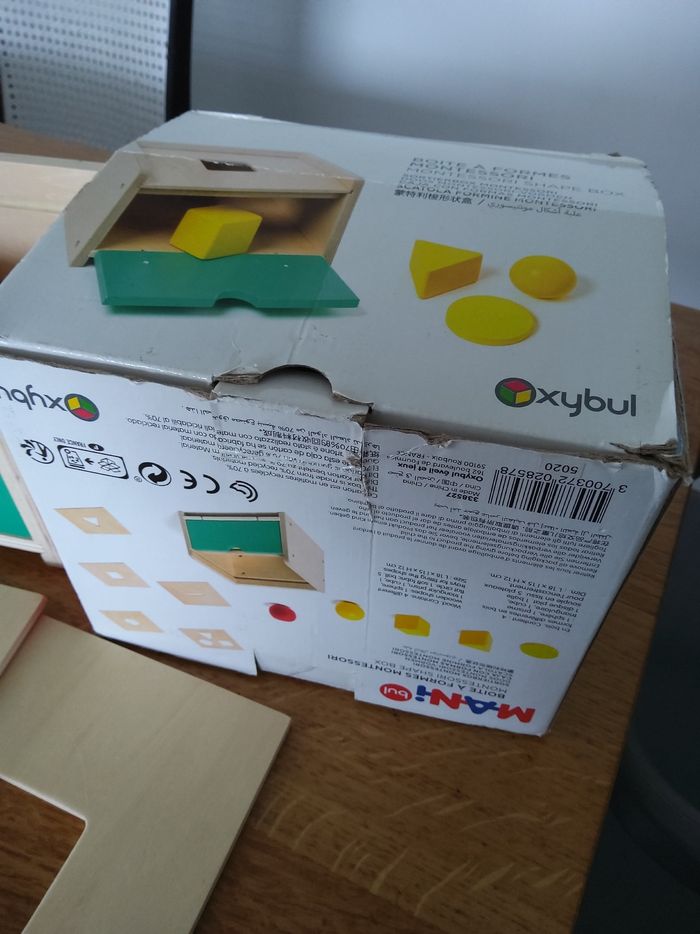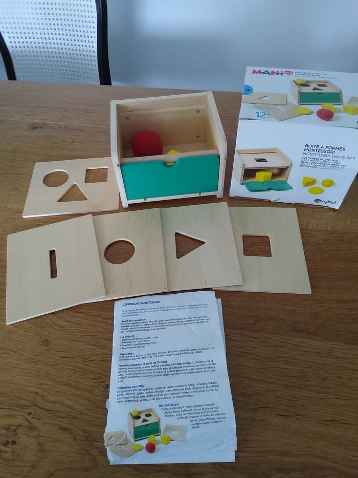 Boîte à formes Montessori, Oxybul, à partir de 12 mois, Boîte en bois complète avec sa notice( qui a subit les mains de bébé 😅) et sa boîte abîmée également. N'hésitez pas à rechercher par # de même catégorie #fifi4935jouets