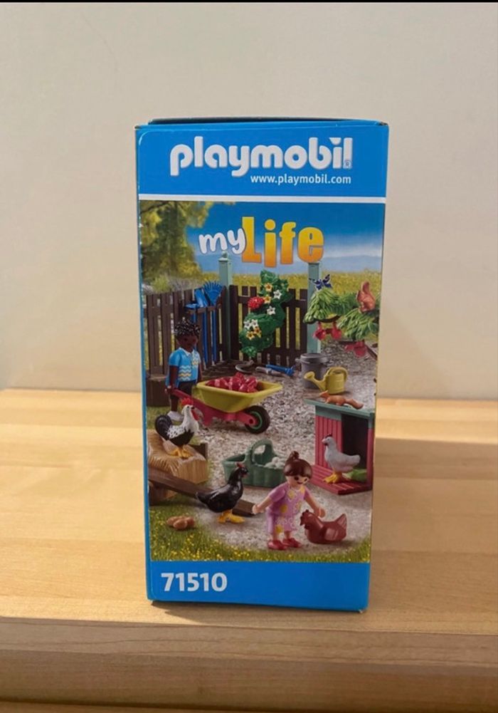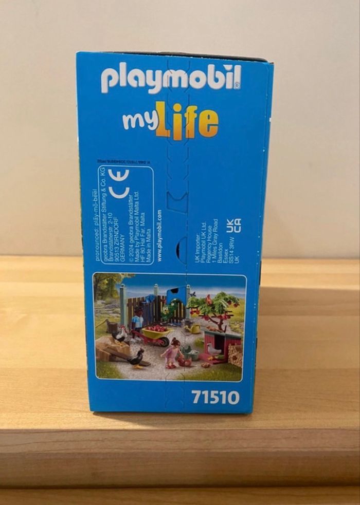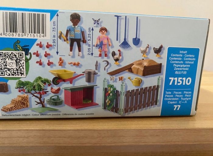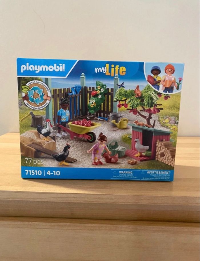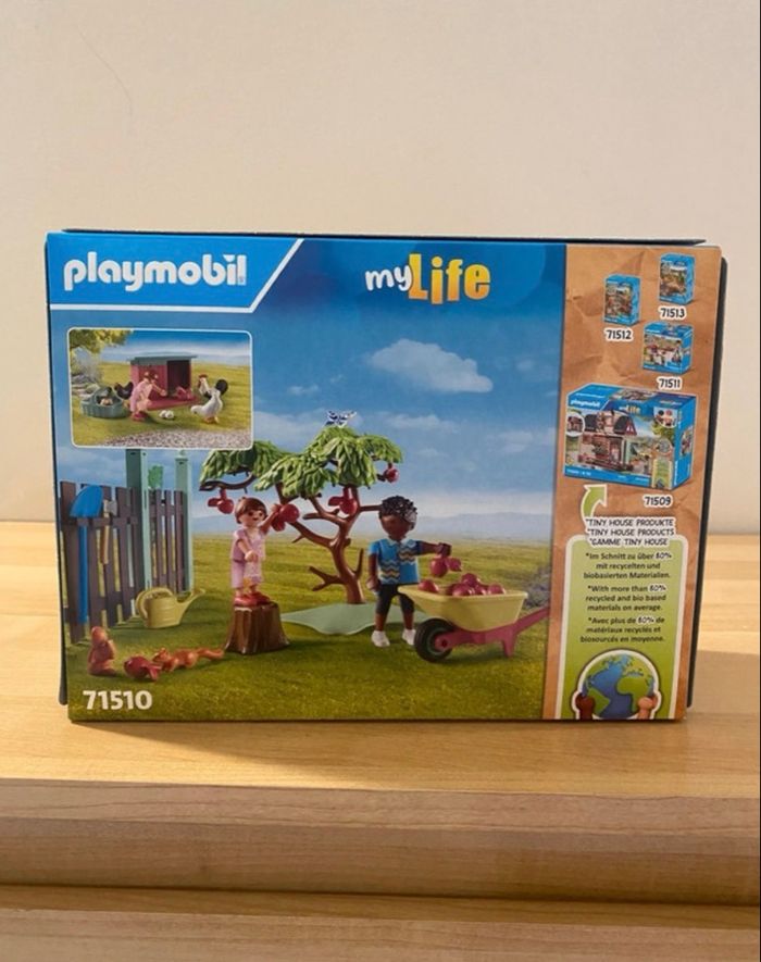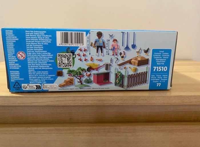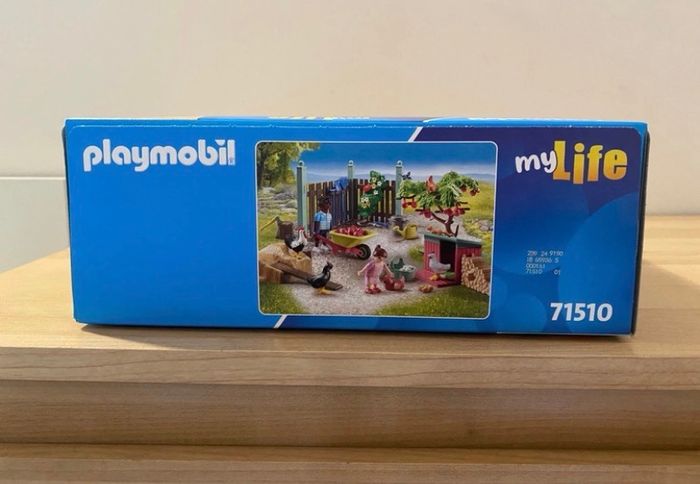 playmobil 71510 poulailler neuf - jamais ouvert - en parfait état envoyé bien protégé. Contenu du coffret : ensemble de 77 pièces avec instructions : 2 personnages inclus, 6 animaux Il y a beaucoup à faire dans ce petit jardin : s'occuper des poules, nettoyer, récolter les pommes, ramasser les œufs. Grâce à la pelle, au râteau et à la brouette, le jardinage est facile