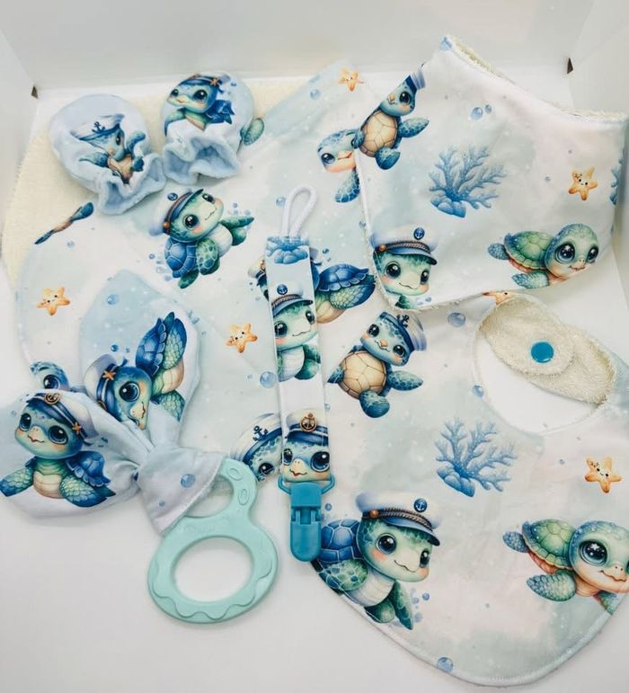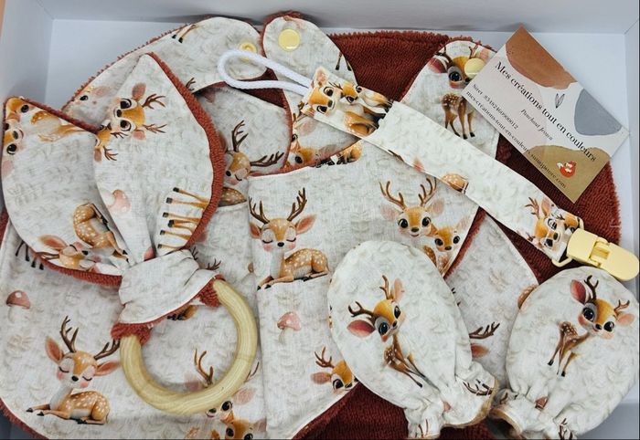 Coffret naissance en coton à motifs et en éponge avec possibilité de personnaliser avec un prénom ou autre selon votre choix. 1 bavoir basic 1bavoir bandana 1attache tétine 1anneau oreille de lapin 1lange pour les régurgitations 1paire de moufles spécial nourrisson Attention les chaussons ne sont pas à vendre sur cette annonce. Vendu à 34€ le coffret au lieu de 37,50€