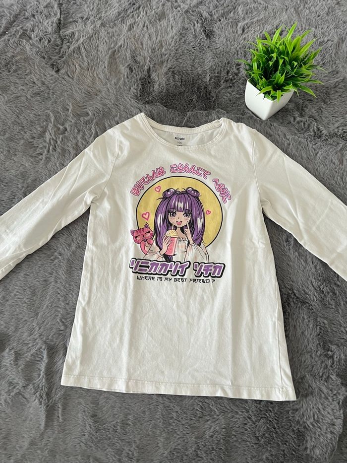 T-shirt manches longues, en très bon état (tâches présentes en bas du t-shirt et sur une manche voir photos) De la marque Kiabi Taille 10 ans