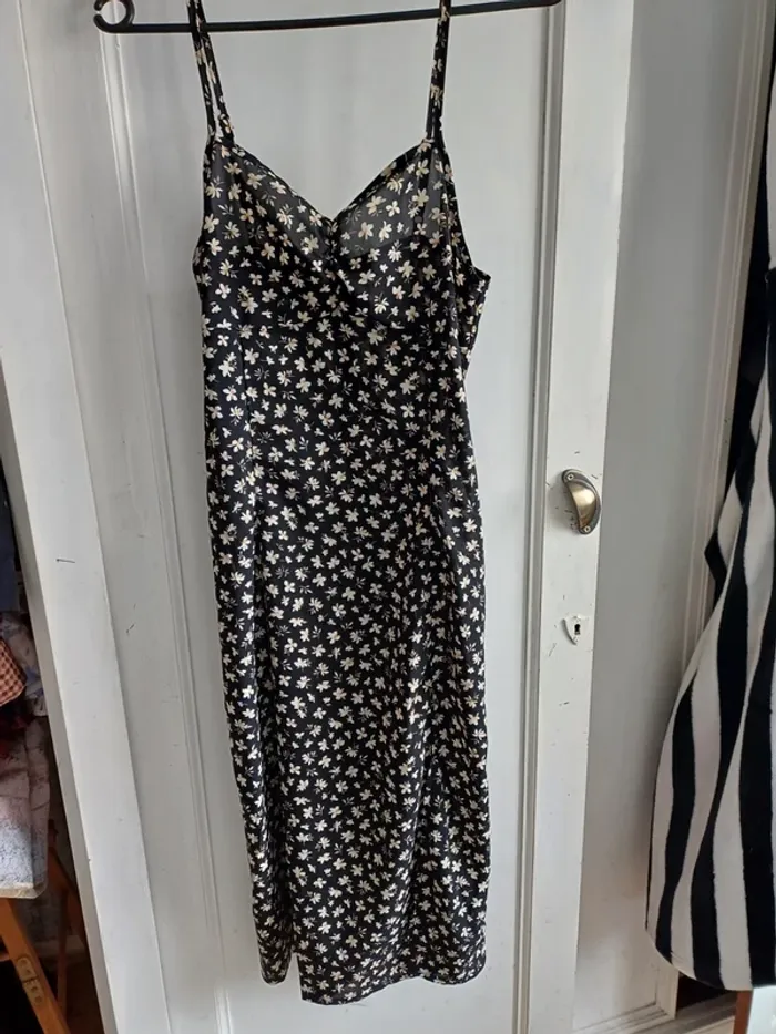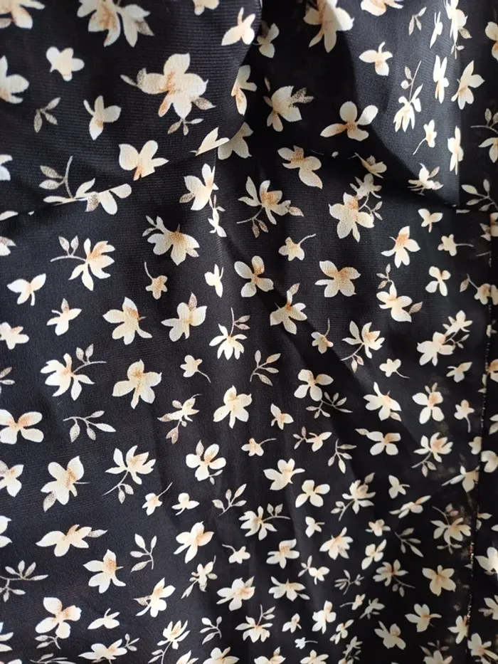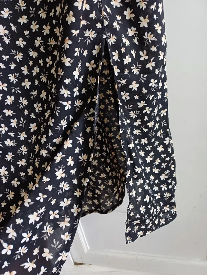 Robe noire mi-longue fendue sur le côté gauche, motifs à fleurs blanches Fermeture à l'arrière Taille M
