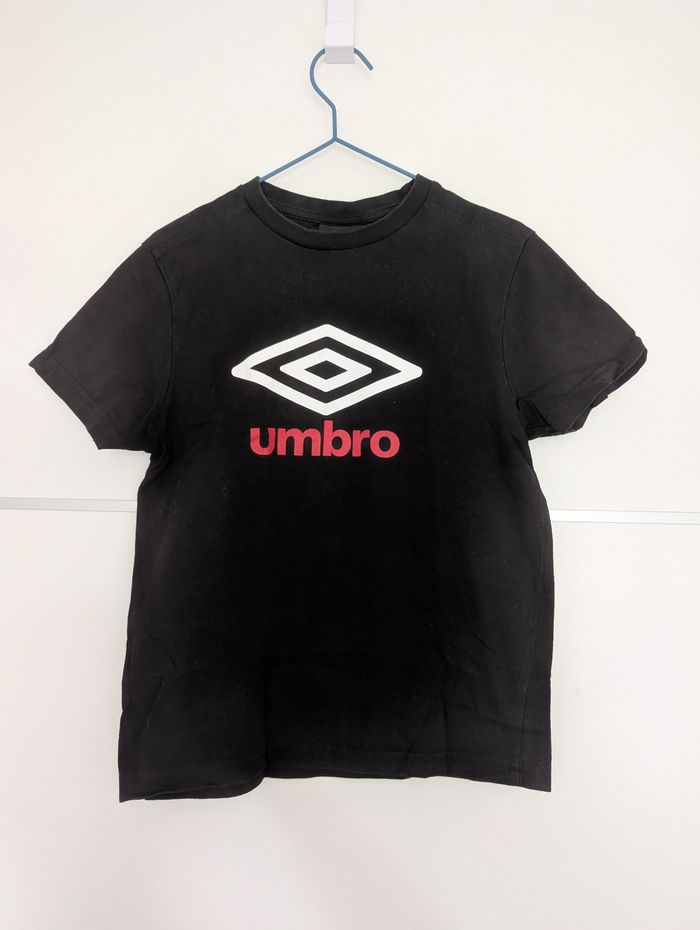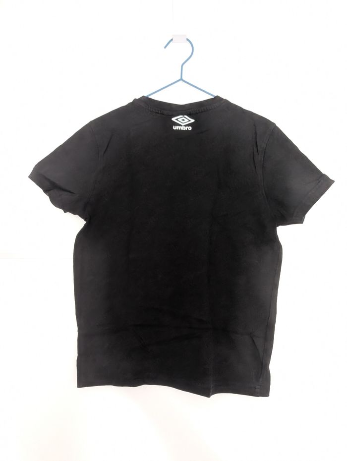 T-shirt noir basique avec le grand logo Umbro iconique sur la poitrine. Le diamant est blanc, et le nom "umbro" est en rouge vif. Marque Umbro Taille 6-7 ans (126 cm).