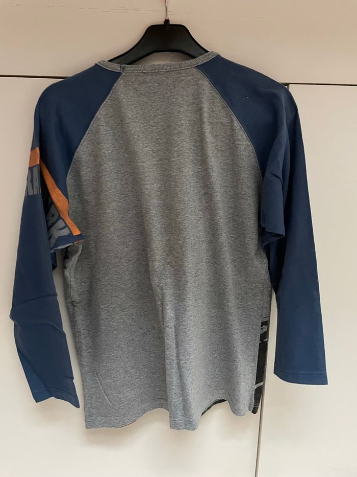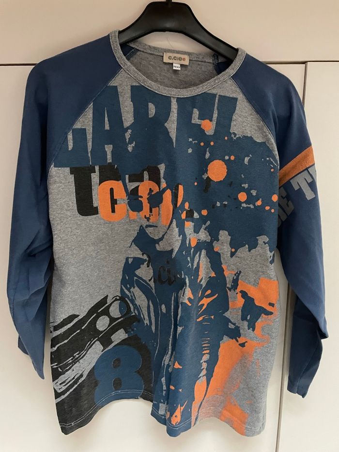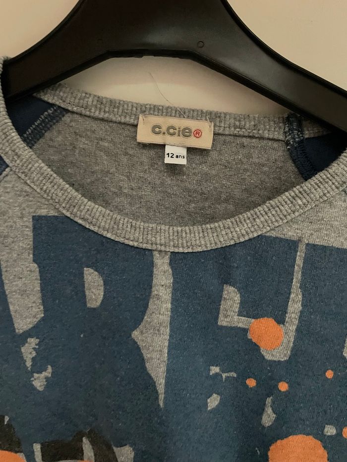 T-shirt manches longues, marque la compagnie des petits. taille 12 ans, couleur à dominante bleue et gris orange