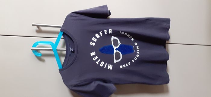 T-shirt à sequins "Kiabi" 12 ans Couleur: bleu marine avec motif "Mister Surfer" (2 images différentes en fonction de l'orientation des sequins. manches courtes 100% coton En excellent état