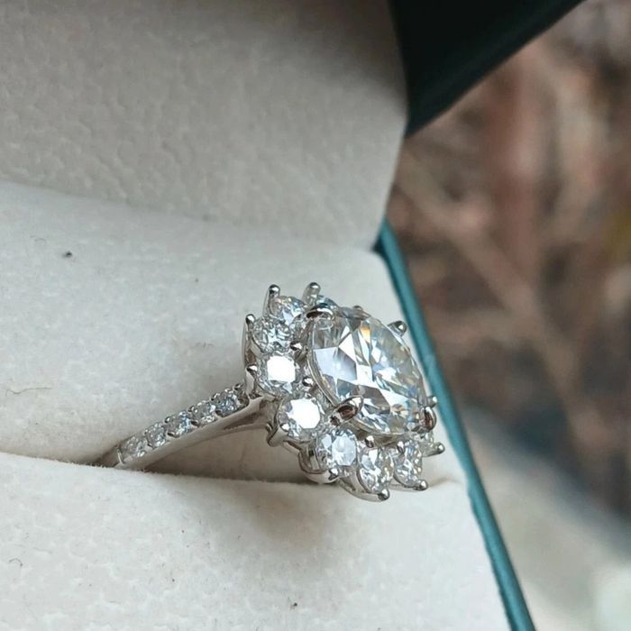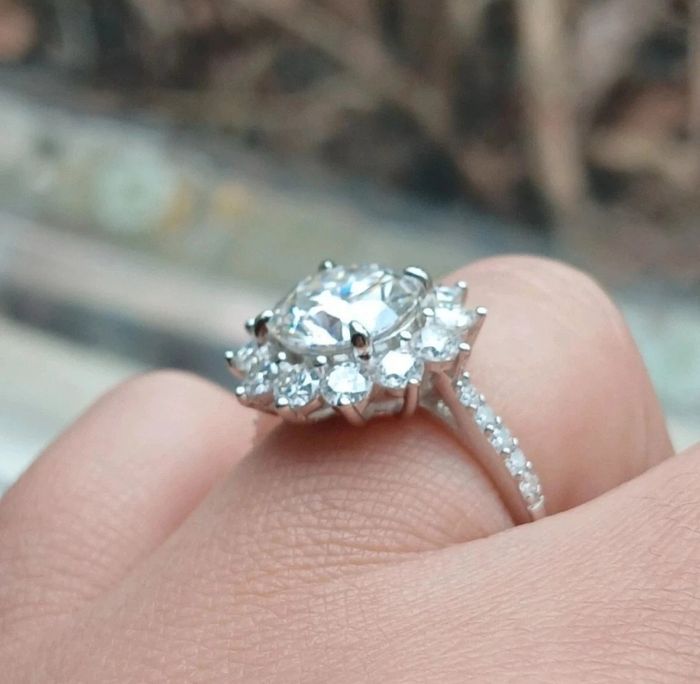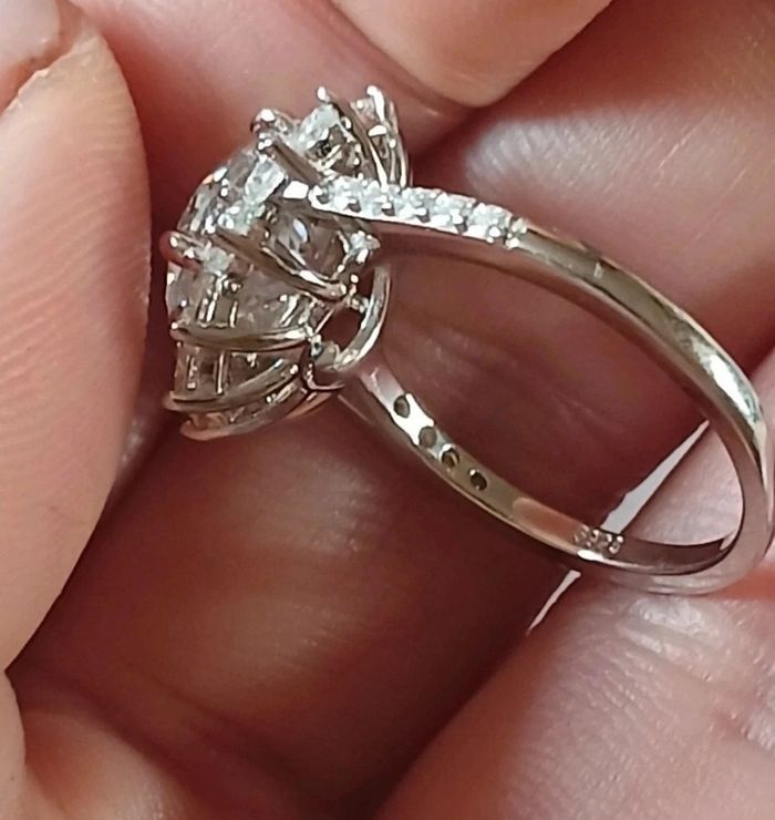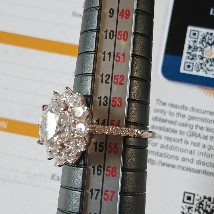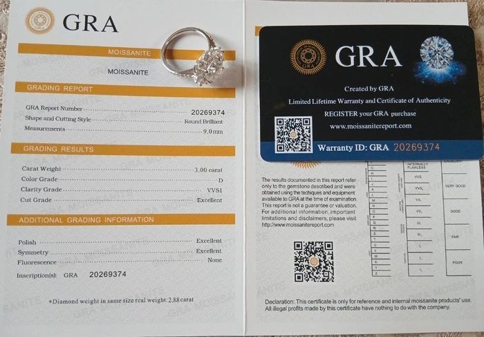 Bague argent rhodié Toutes les pierres sont des moissanites - Pierre centrale : 3cts - certificat GRA - Pavage moissanites 1,35ct Taille 54/54,5 Jamais portée Vendue avec certificat GRA Livrée dans un pochon Ou dans un écrin en velours noir UNIQUEMENT si achat au prix affiché