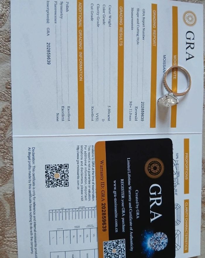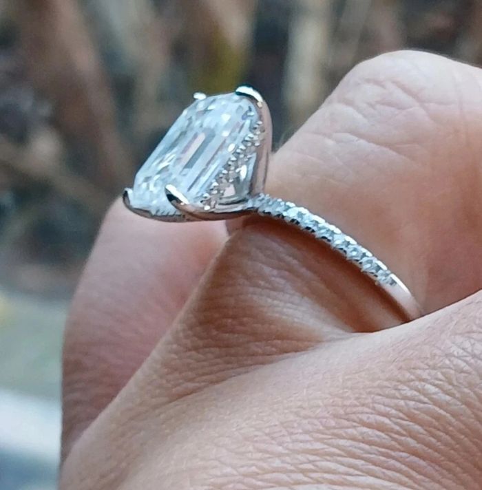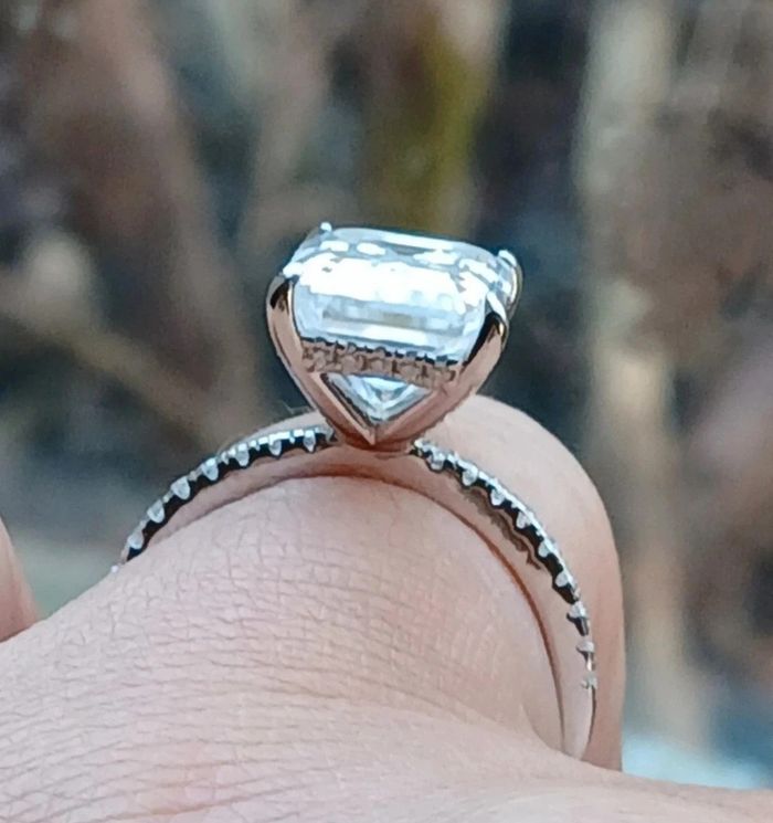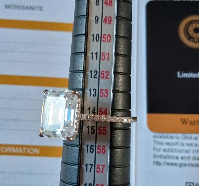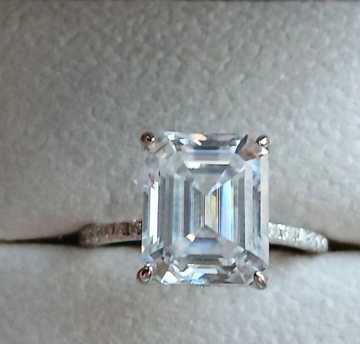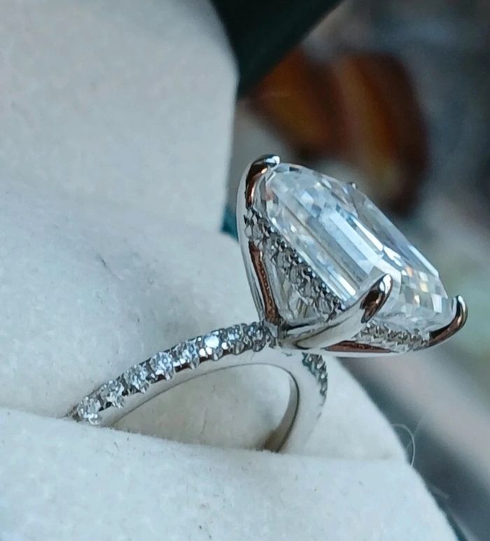 Bague en argent rhodié Toutes les pierres sont des moissanites - Pierre centrale taille émeraude 5cts - D/VVS1 avec certificat GRA *9×11mm - Pavage moissanites 0,25ct (sur l’anneau et en halo sous la pierre) Taille 54/54,5 Jamais portée Toutes les pierres passent le test du diamant Vendue avec certificat GRA Livrée dans un pochon Ou dans un écrin en velours noir UNIQUEMENT si achat au prix affiché