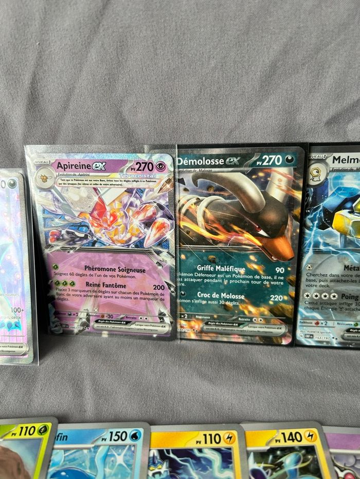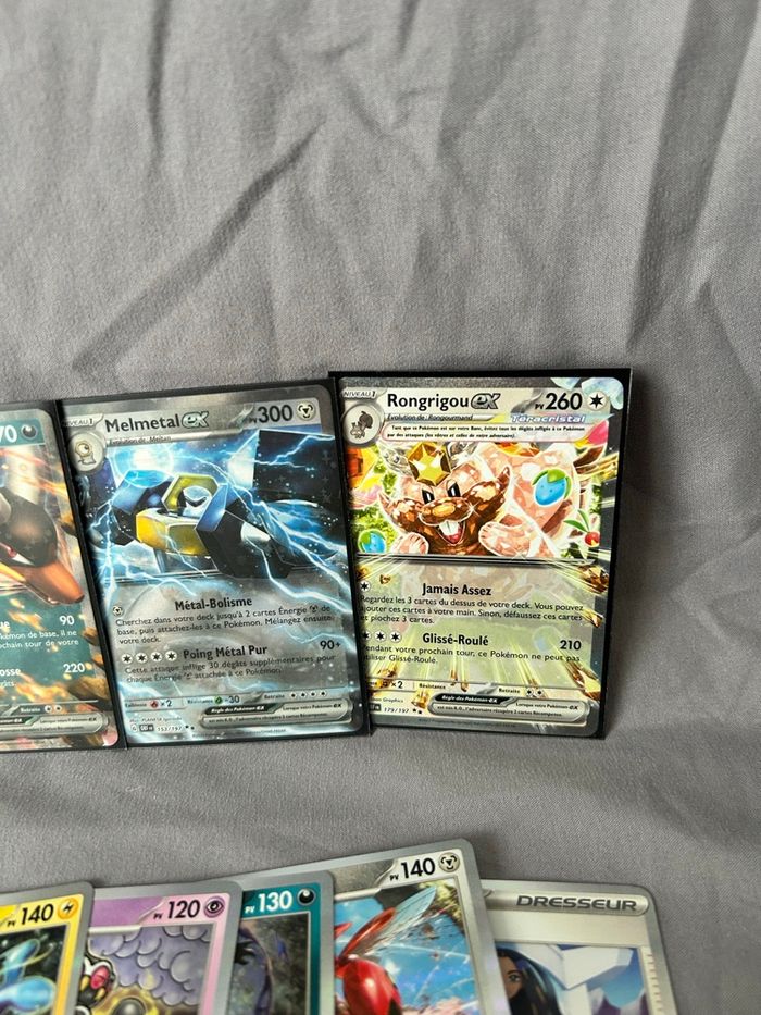 Lot de 137 cartes Pokémon Bloc écarlate et violet EV3 Série Flammes Obsidiennes OBF 1 Full Art - Absol ex 214 4 ex - Apireine, Démolosse, Melmetal et Rongrigou 9/10 holo 123/166 communes peu communes La Fa et les ex sont sous sleeve et toploader 20€ le lot soit moins de 0,15€ par carte !