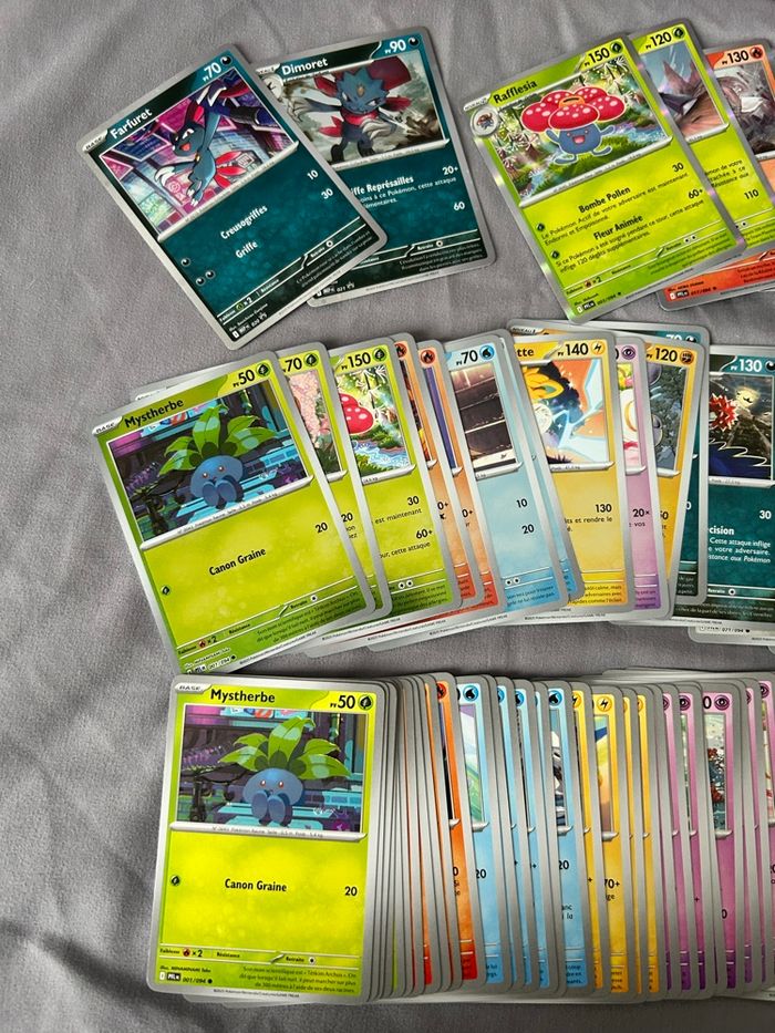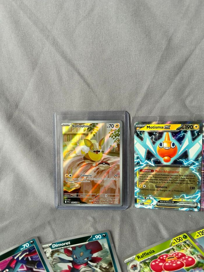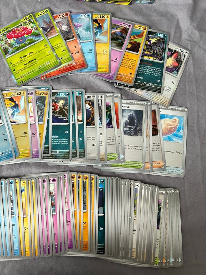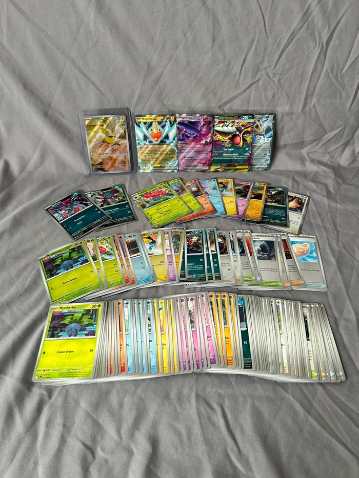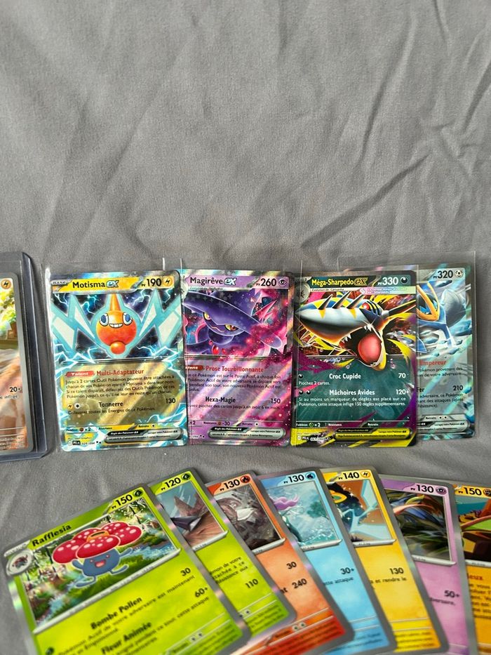 Lot de 112 cartes Pokémon Bloc Mega Évolution ME2 Série Flammes Fantasmagoriques PFL 74/74 cartes communes/peu communes 22 reverses 2 holo cosmo promo 9/10 holo 4 ex (motisma ex 029, magireve ex 036, mega sharpedo ex 061 et pingoleon ex 070) 1 ar (Voltoutou 099) Sortie de booster, les ex et la ar sous sleeve + toploader 18€ le lot (soit moins de 0,20€ la carte)