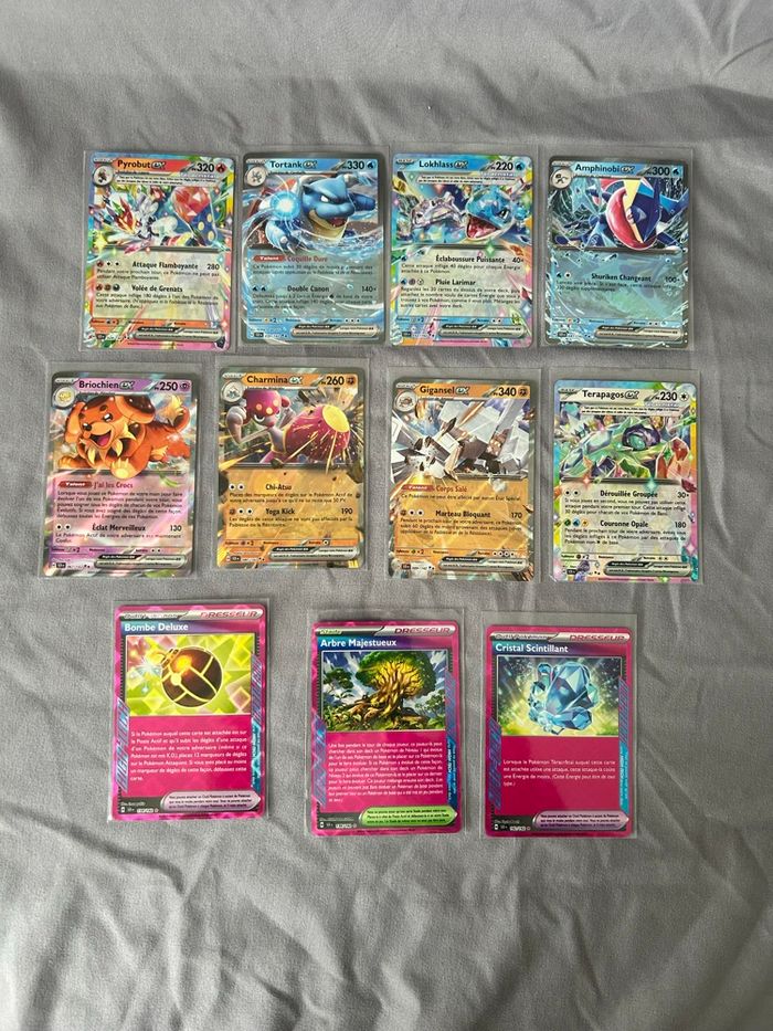 Lot 11 cartes Pokémon Bloc Écarlate et Violet (EV7) Série couronne stellaire SCR 8 cartes ex ( pyrobut, Tortank, lokhlass, amphinobi, briochien, charmina, gigansel et terapagos) 3 ace (bombe deluxe, arbre majestueux et cristal scintillant) Sous sleeve et toploader
