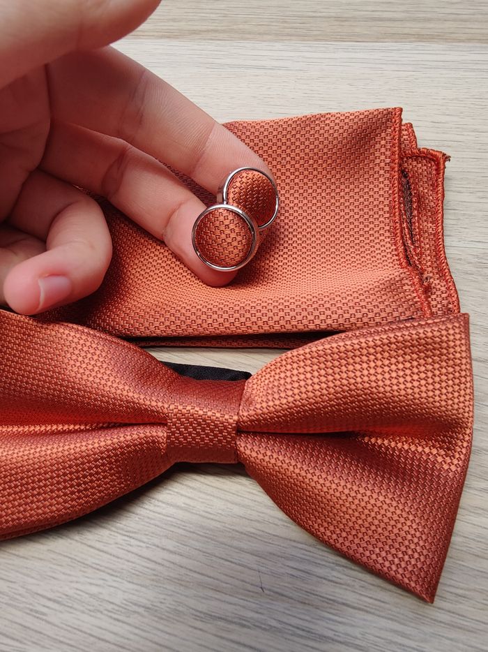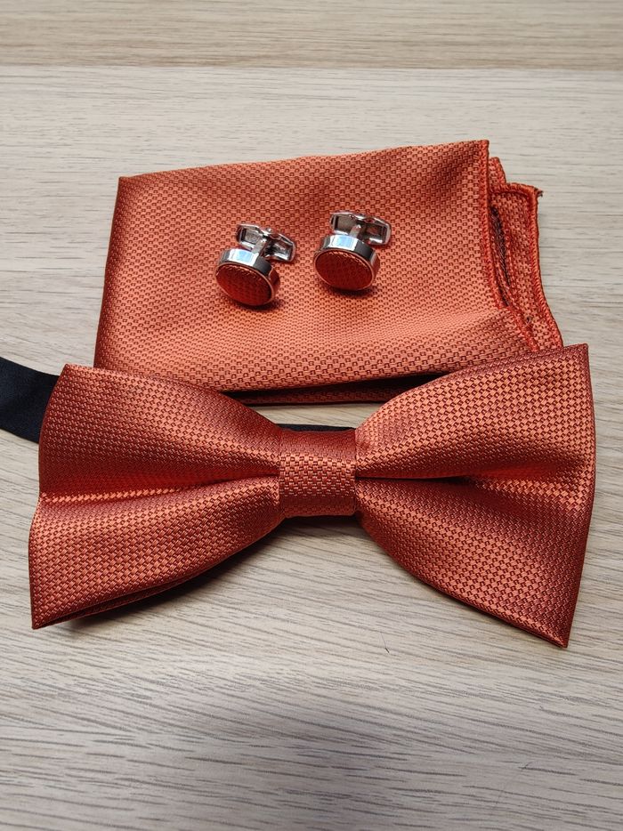 Nœud papillon orange terracotta+ boutons de manchettes + mouchoir de pochette  - photo numéro 1