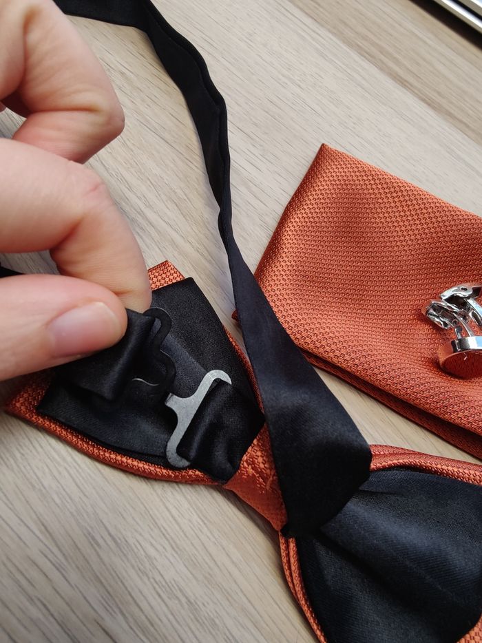 Nœud papillon orange terracotta+ boutons de manchettes + mouchoir de pochette  - photo numéro 3
